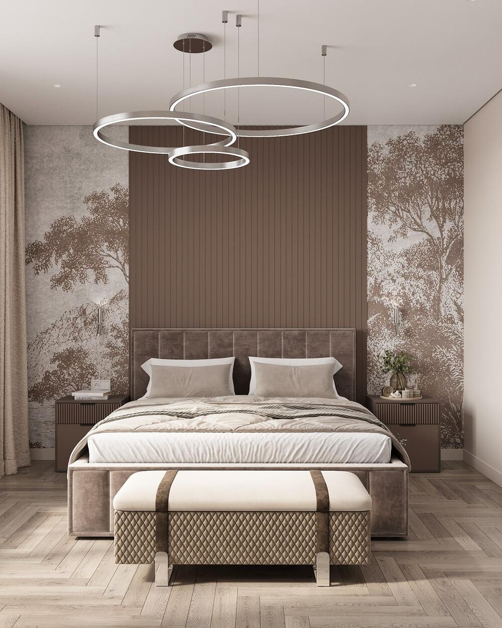 Мастер-спальня получилась просторной, теплой и очень спокойной. Здесь всё для отдыха — большая кровать с мягким изголовьем, приятные на ощупь материалы и сдержанная цветовая гамма. Основу составляют бежевые и шоколадные оттенки, которые создают ощущение уюта и защищенности.