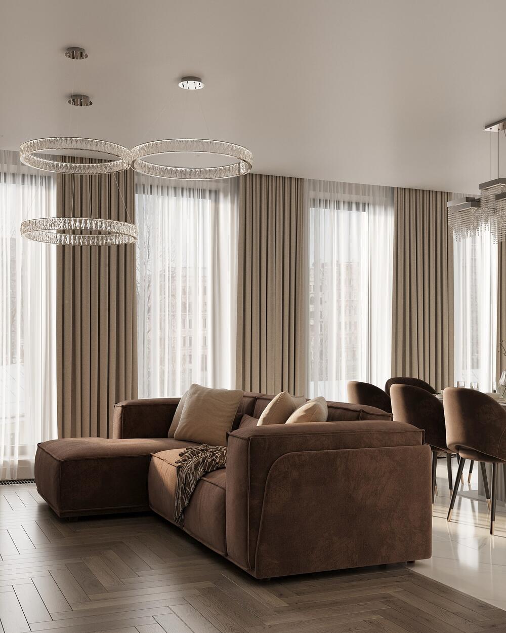 Гостиная спланирована как часть общего пространства с кухней, но визуально ощущается как отдельная зона для отдыха. Главный акцент — мягкий диван теплого шоколадного цвета, который стоит напротив ТВ-зоны. Именно об этом просил заказчик: удобное место, где можно всей семьёй смотреть фильмы.