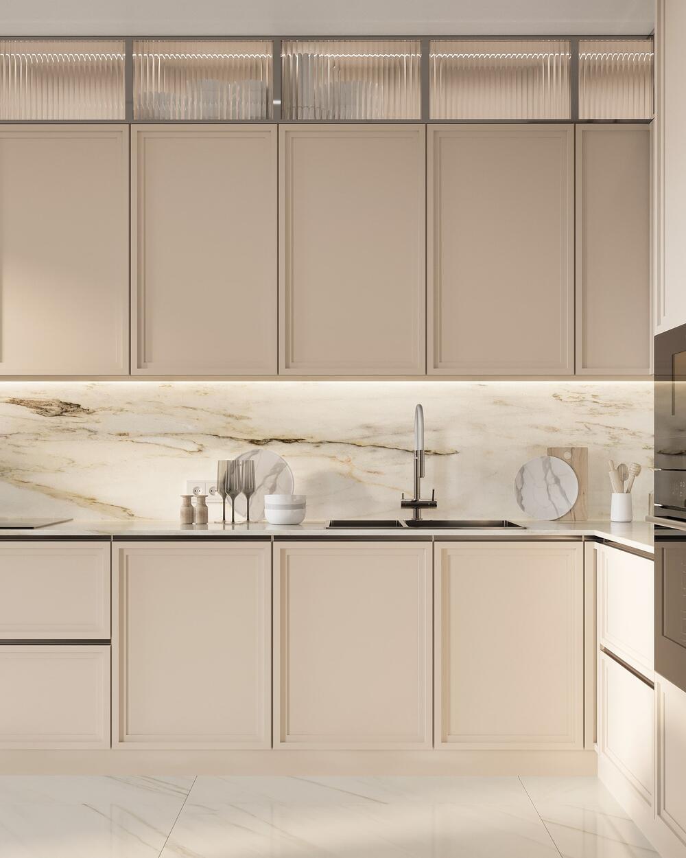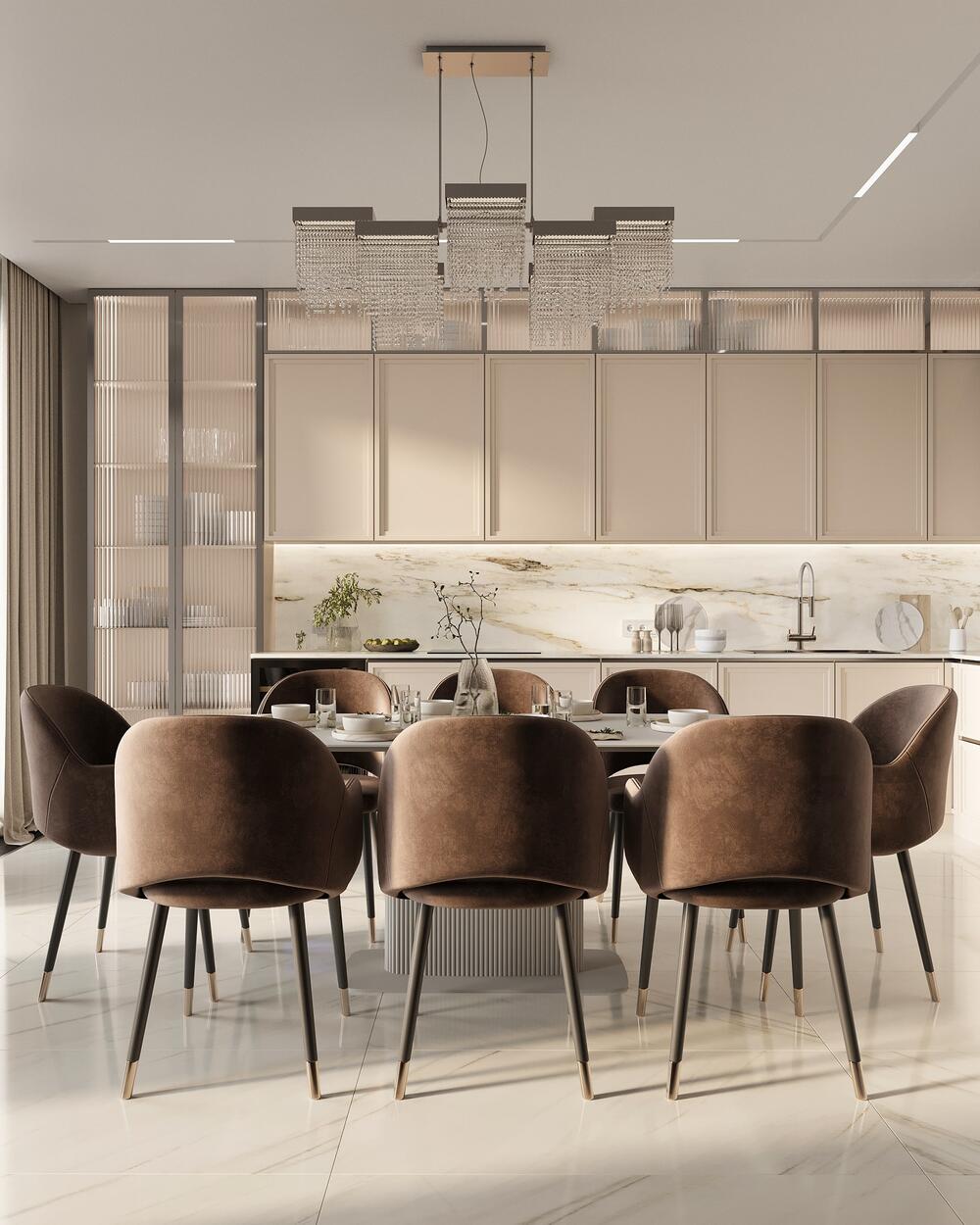 Прозрачные витрины с подсветкой визуально расширяют кухню-столовую, добавляют воздуха и делают интерьер наряднее. При этом они сохраняют функциональность: здесь можно хранить красивую посуду, бокалы и декор.