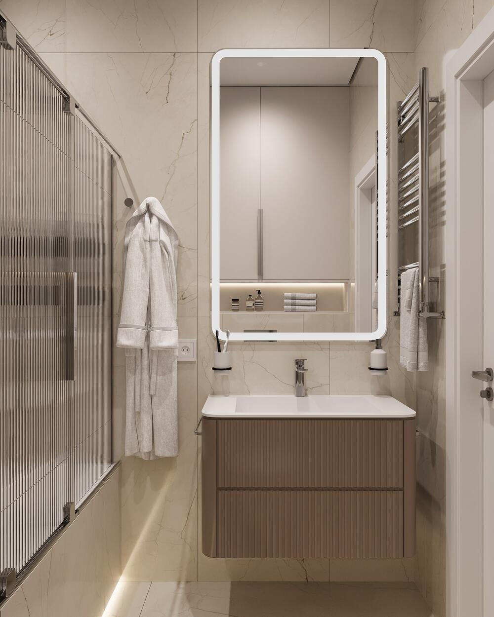 В отделке использован крупноформатный керамогранит с текстурой натурального камня: минимум швов, легко убирать, выглядит дорого. Свет продуман: есть и общий, и мягкая подсветка — можно создать спокойную атмосферу перед сном.