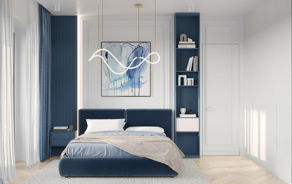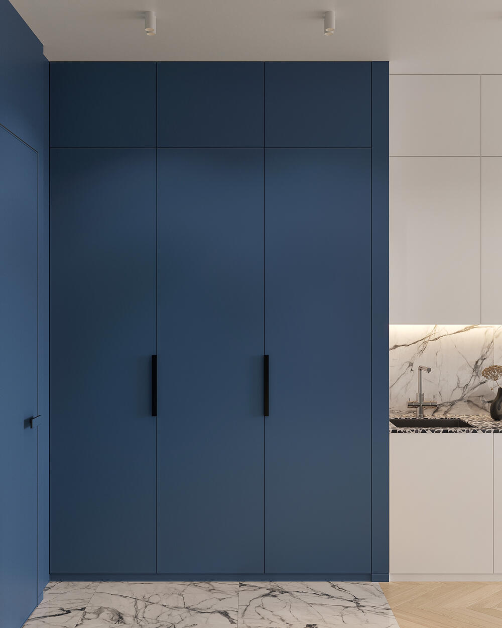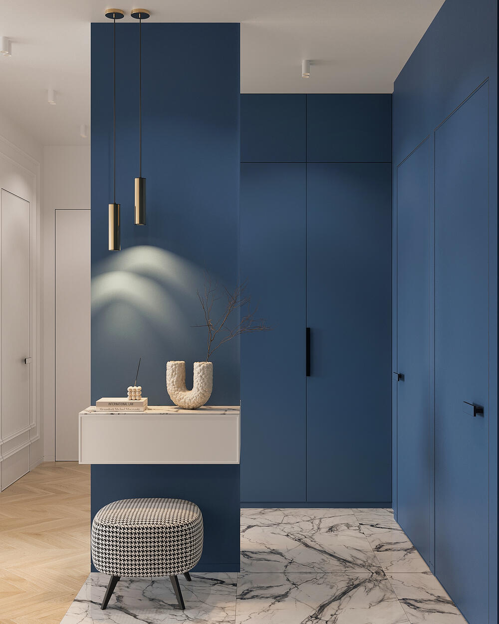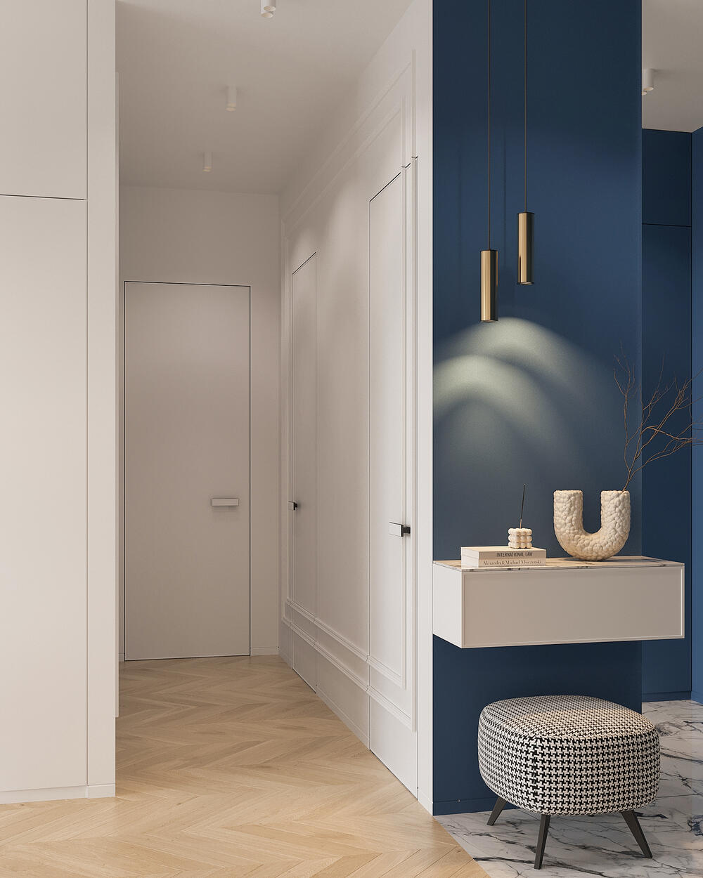 Современный дизайн интерьера квартиры с синими акцентами в ЖК «Now» — 56 м²