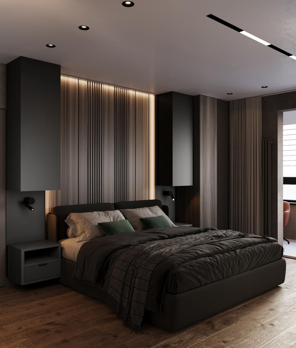За счёт тёмных древесных оттенков и мягкого текстиля спальня выглядит стильно и современно, но при этом остаётся очень «жилая».