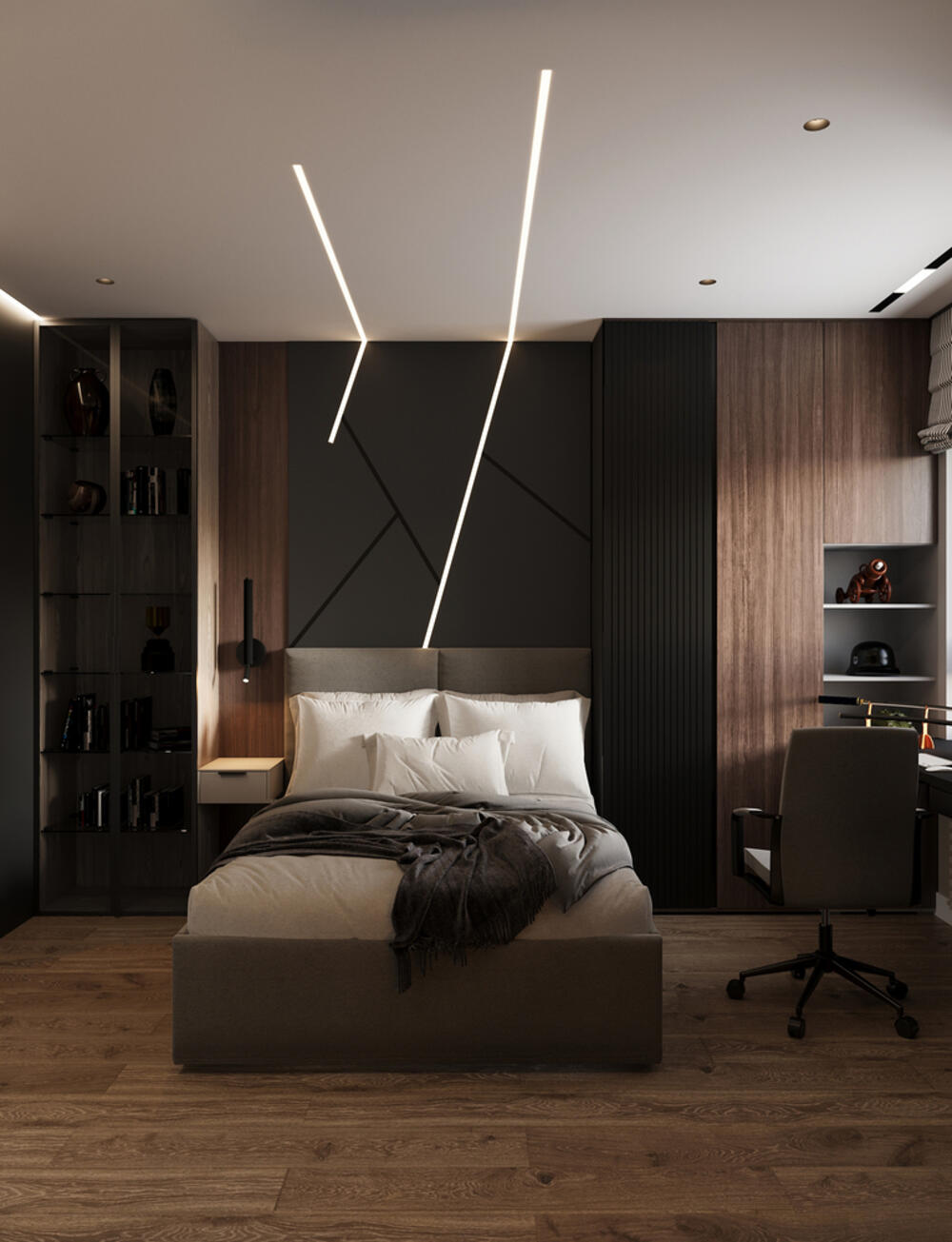 В отделке использованы тёмные оттенки и строгие линии — это подчёркивает характер комнаты и отвечает возрасту хозяина. Не перегружает пространство деталями, мы сделали его современным и удобным для жизни.