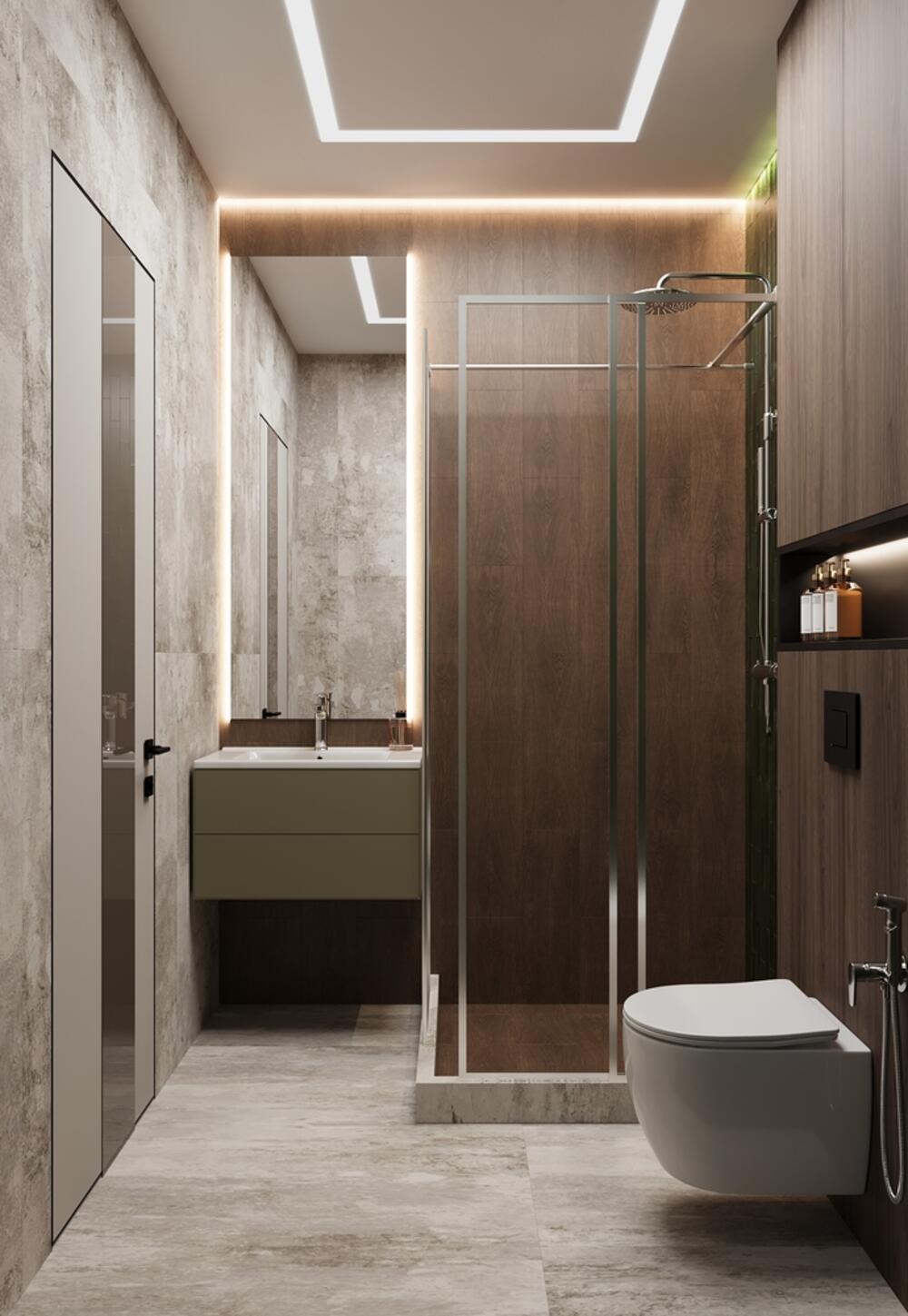 Практичные материалы — керамогранит и влагостойкие панели — делают помещение не только красивым, но и долговечным.