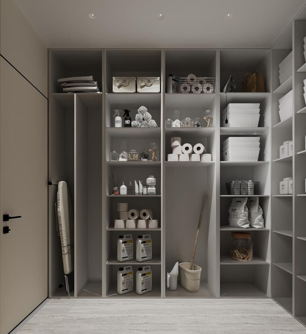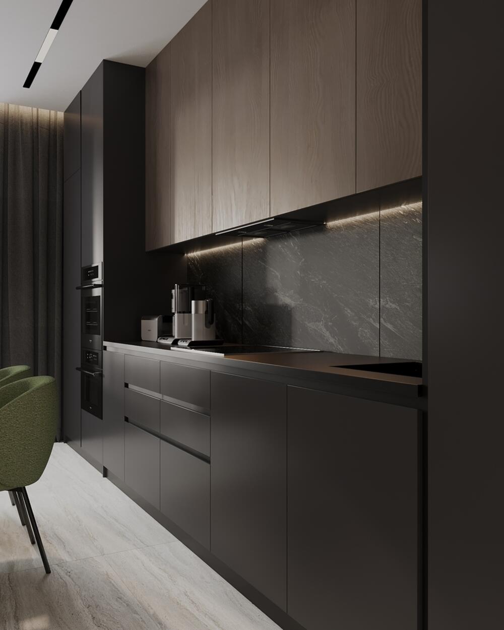 Рабочая зона собрана в одну линию: всё под рукой, готовить удобно и без суеты. Рядом — кладовая, куда можно убрать лишнюю технику и запасы. Это сильно разгружает интерьер и помогает поддерживать порядок.