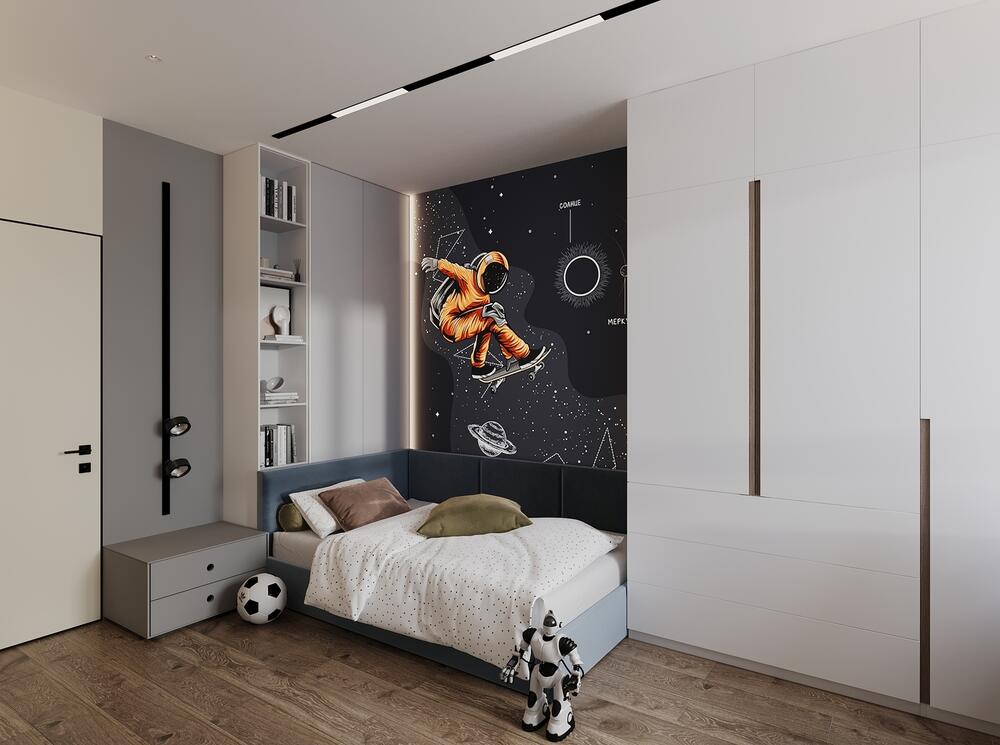 Главный акцент комнаты — стена с рисунком космонавта. Она задаёт настроение всей комнате: яркая, динамичная и вдохновляющая. Такой элемент помогает ребёнку чувствовать, что пространство создано именно для него.