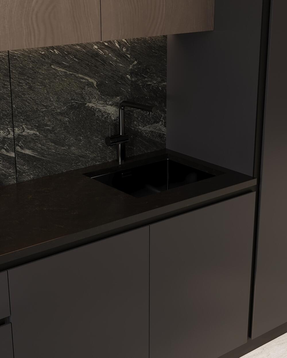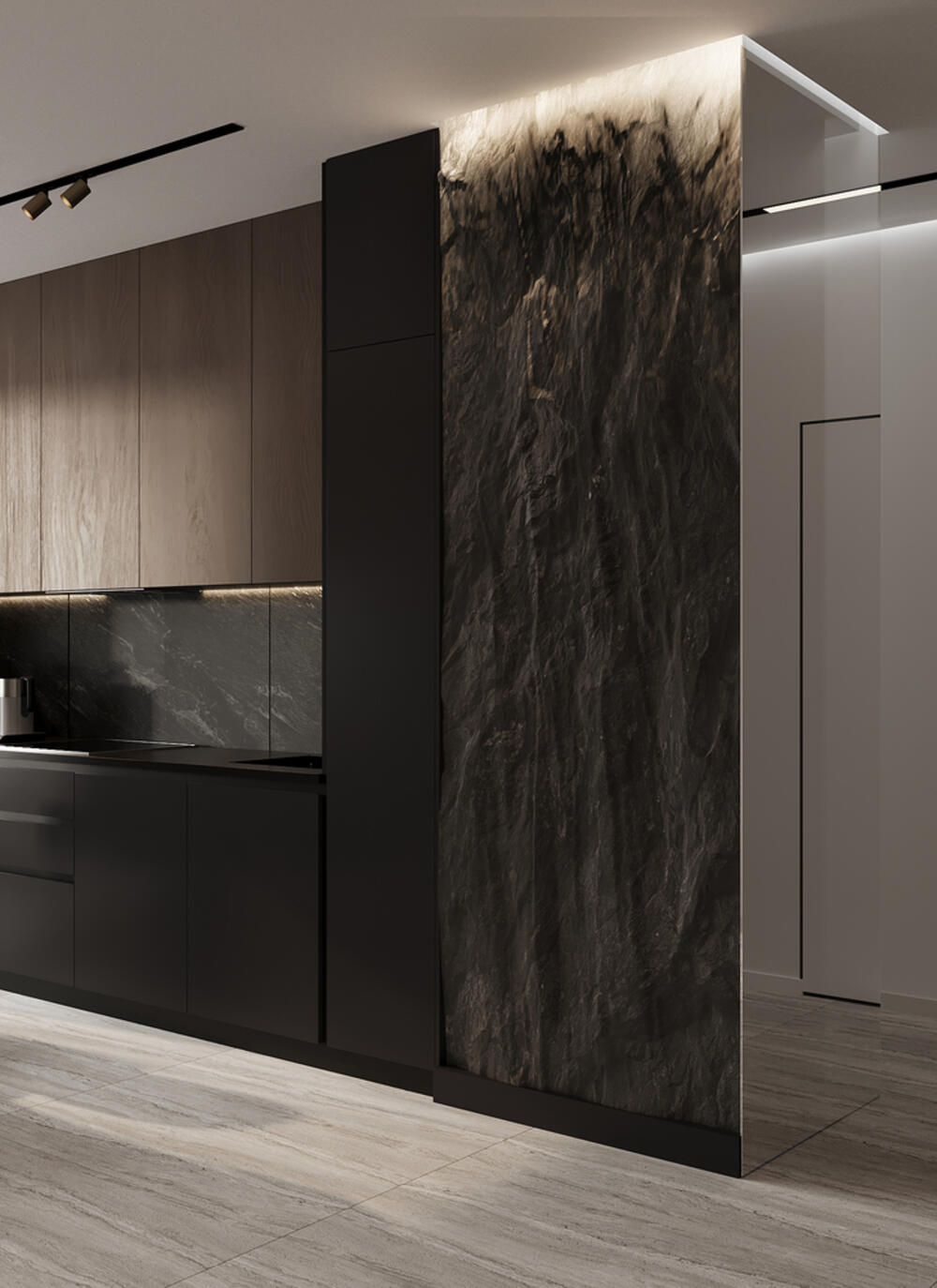 «Скала» в зоне кухни — декоративная панель с фактурой натурального камня стала ярким акцентом интерьера. Она выглядит как арт-объект и задаёт настроение всей кухонной зоне.