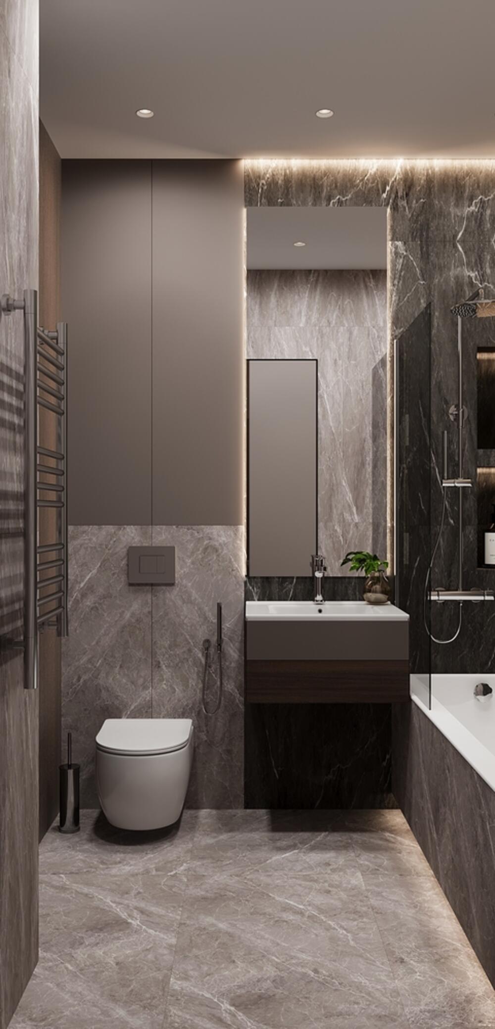 Ванная комната получилась эффектной за счёт тёмного камня и подсветки по периметру. Такой приём делает пространство визуально глубоким и уютным.