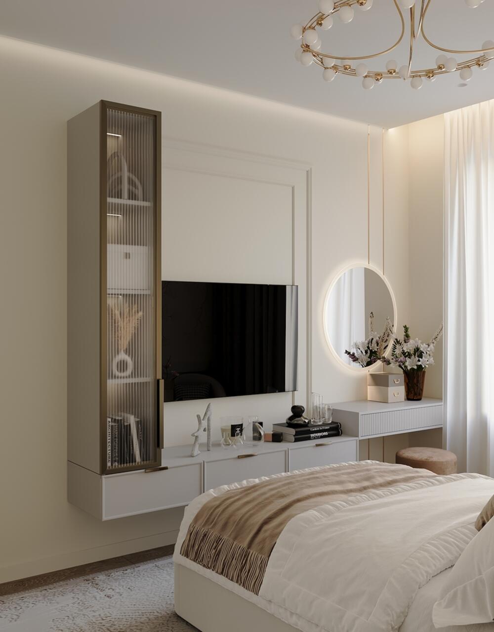 Здесь есть всё необходимое: удобная кровать, шкаф для хранения и небольшой туалетный столик у окна. Освещение подобрали многоуровневое: потолочная люстра, бра и подсветка мебели. Это даёт возможность менять атмосферу — от яркой для чтения до мягкой вечерней.