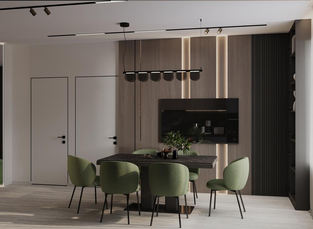 В основе проекта — современный минимализм. Пространство построено на чётких линиях, лаконичной мебели и тщательно подобранных акцентах.