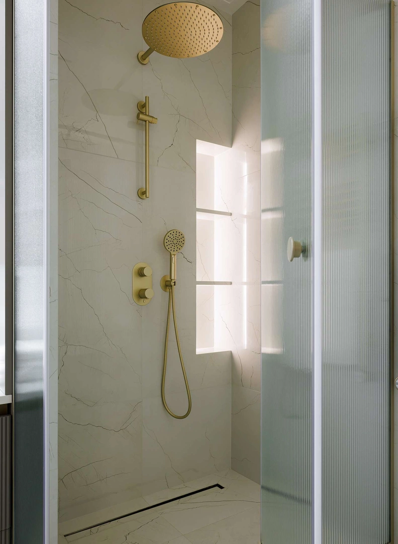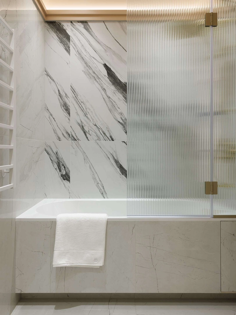 Душевая зона оборудована стеклянными перегородками с рельефным рисунком, а полотенцесушитель в золотом оттенке поддерживает общую цветовую палитру ванной комнаты.