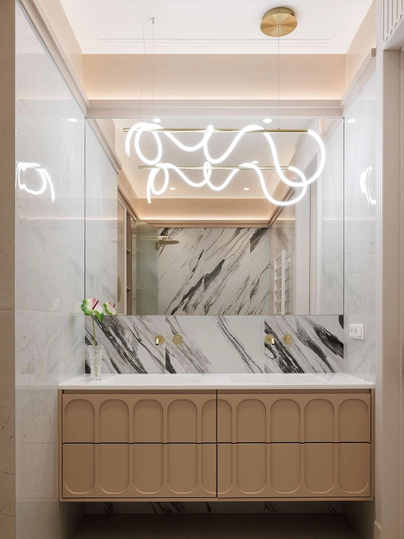 Большое зеркало визуально увеличивает пространство, а встроенные шкафы обеспечивают скрытое хранение. Потолочный светильник с изогнутыми стеклянными элементами создает эффект мягкой подсветки.