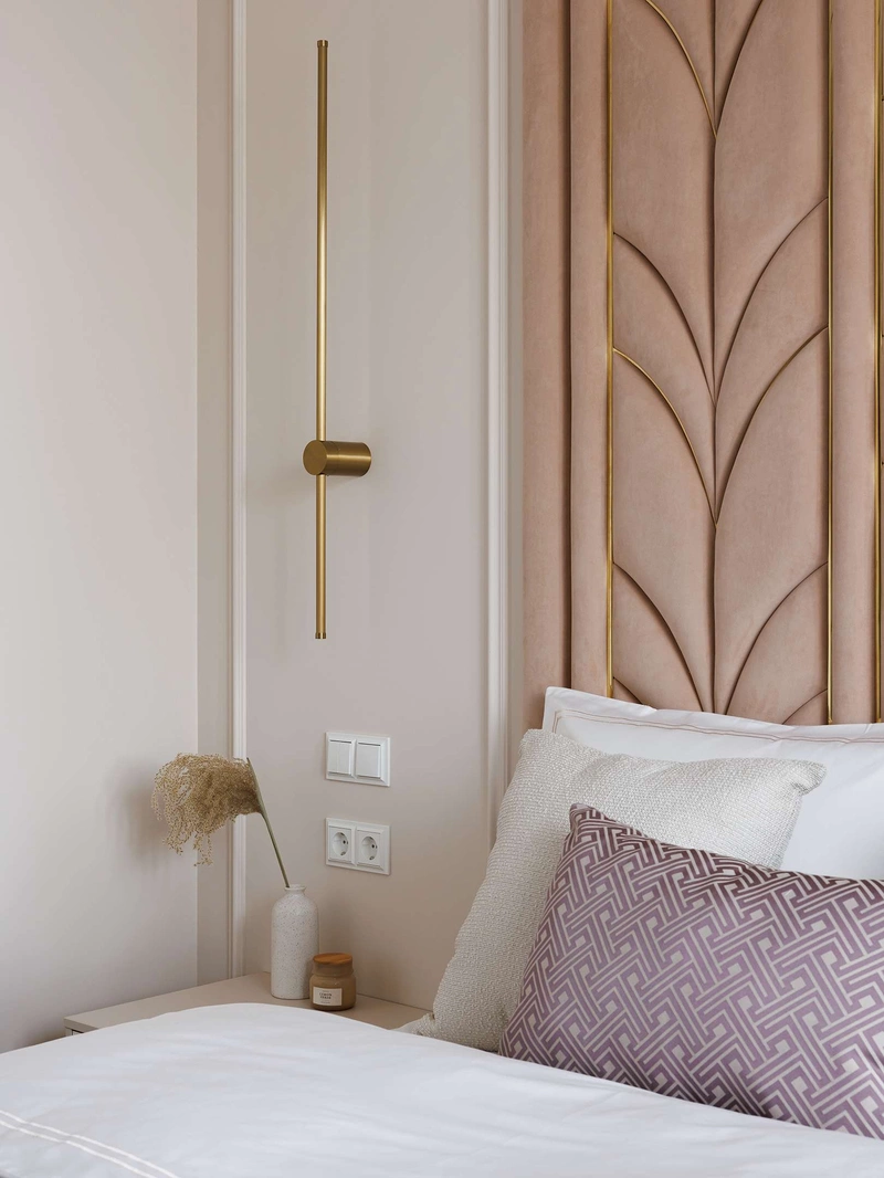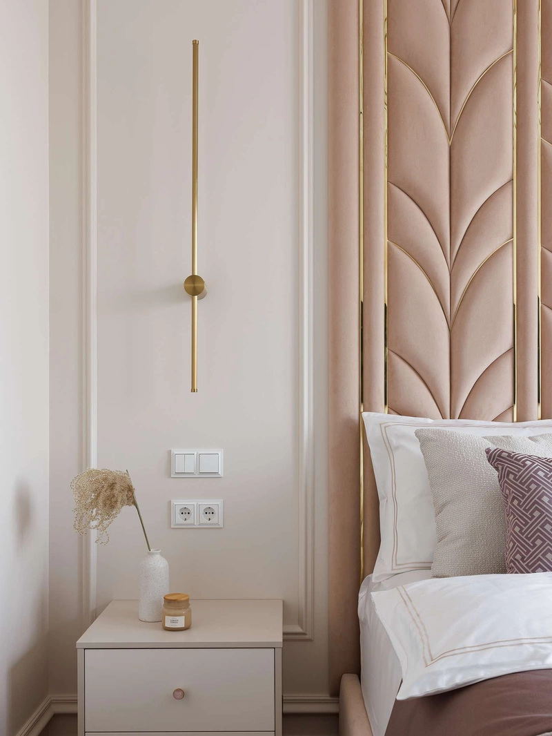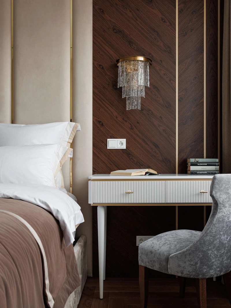 Изголовье кровати дополнено панелью с вертикальными вставками, выполненными из мягкого текстиля и декоративной латунной фурнитуры. Контрастная деревянная стена с рисунком "елочка" привносит тепло и текстуру.