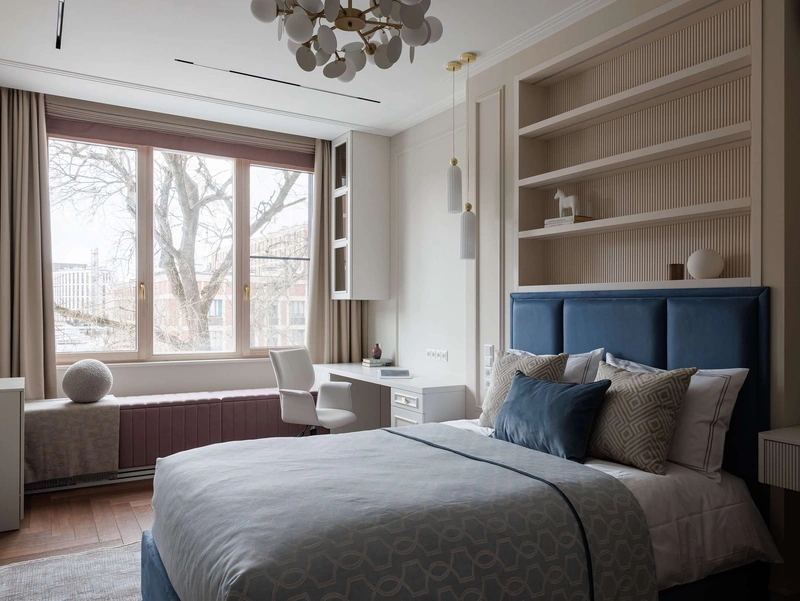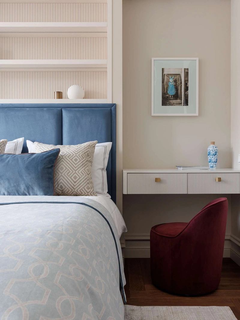Текстиль: шторы и обивка мебели из премиальных тканей в приглушенных тонах. В спальнях использованы мягкие бархатистые текстуры для изголовий кроватей.