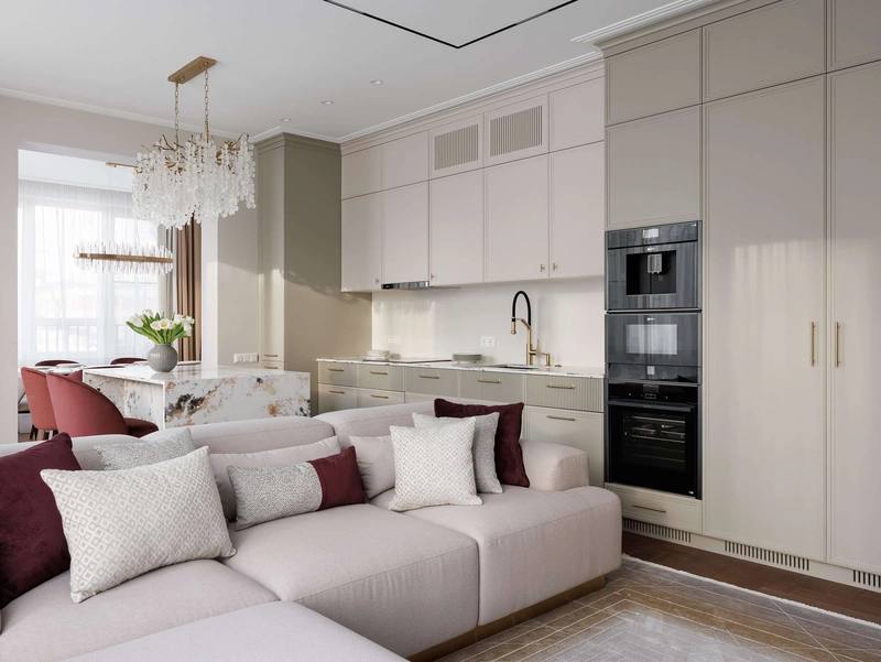 Стиль: современная классика с акцентом на изысканность и утонченность. Интерьер сочетает элегантные формы, функциональные решения и внимание к деталям. Линии мягкие, плавные, мебель с изящной фурнитурой, что создает ощущение гармонии и уюта.