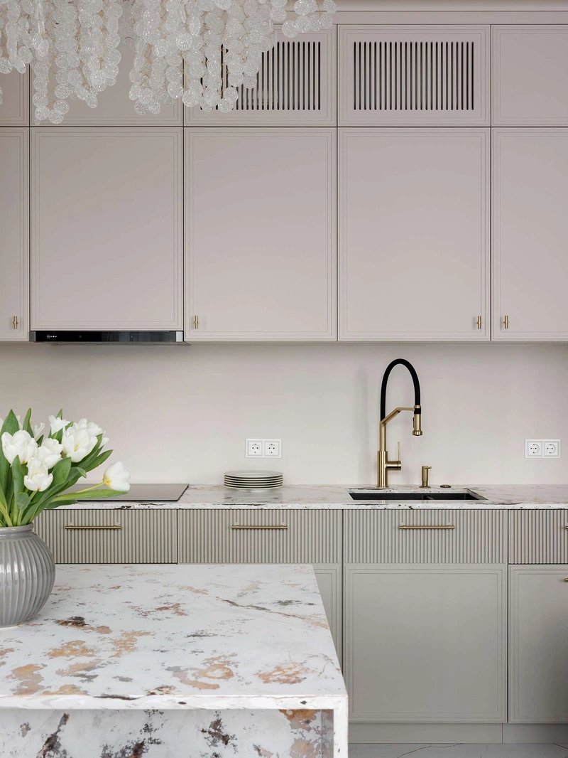 Мебель: встроенные шкафы с подсветкой и фасадами с минималистичной фрезеровкой. Кухонные фасады дополнены декоративными решётками для конвекции. Остров в зоне кухни выполнен из камня с выразительным природным рисунком.