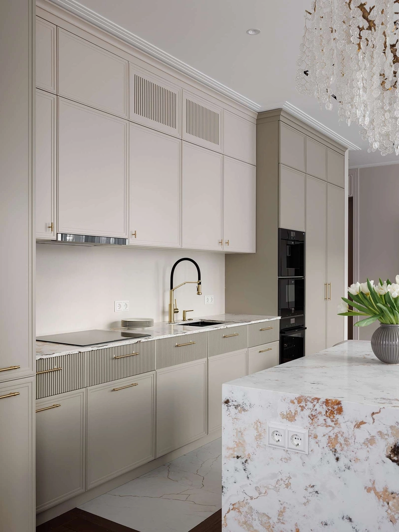 Фасады кухни выполнены с фрезеровкой, добавляющей рельефности и утонченности. Фартук из состаренного зеркала с фацетом создает эффект дополнительного пространства.