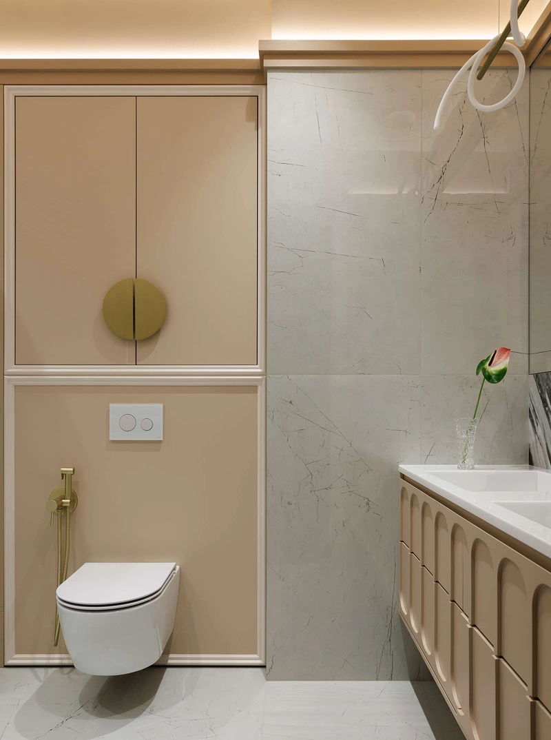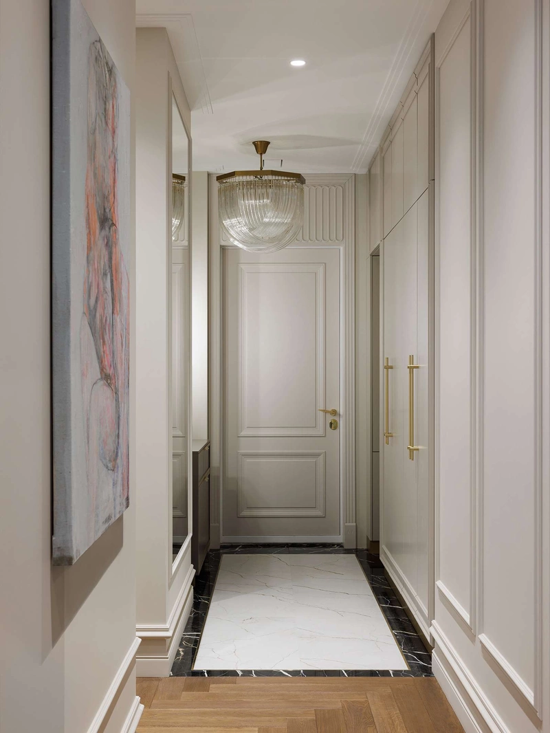 Пространство выполнено в молочных тонах с черными и золотыми акцентами. Пол украшен мраморной плиткой с контрастной черной окантовкой.