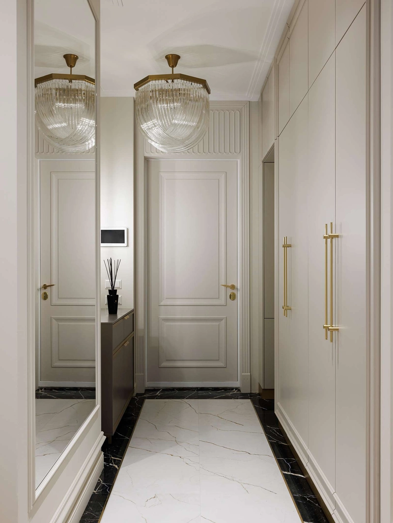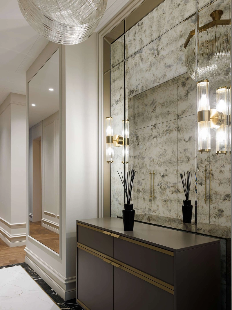 Декоративное зеркало в фартуке кухни и в зоне прихожей визуально расширяет пространство, добавляет свет и деликатный блеск. Это приём, который делает интерьер выразительным, но не перегруженным. Такой элемент работает как акцент — и функциональный, и эстетичный одновременно.