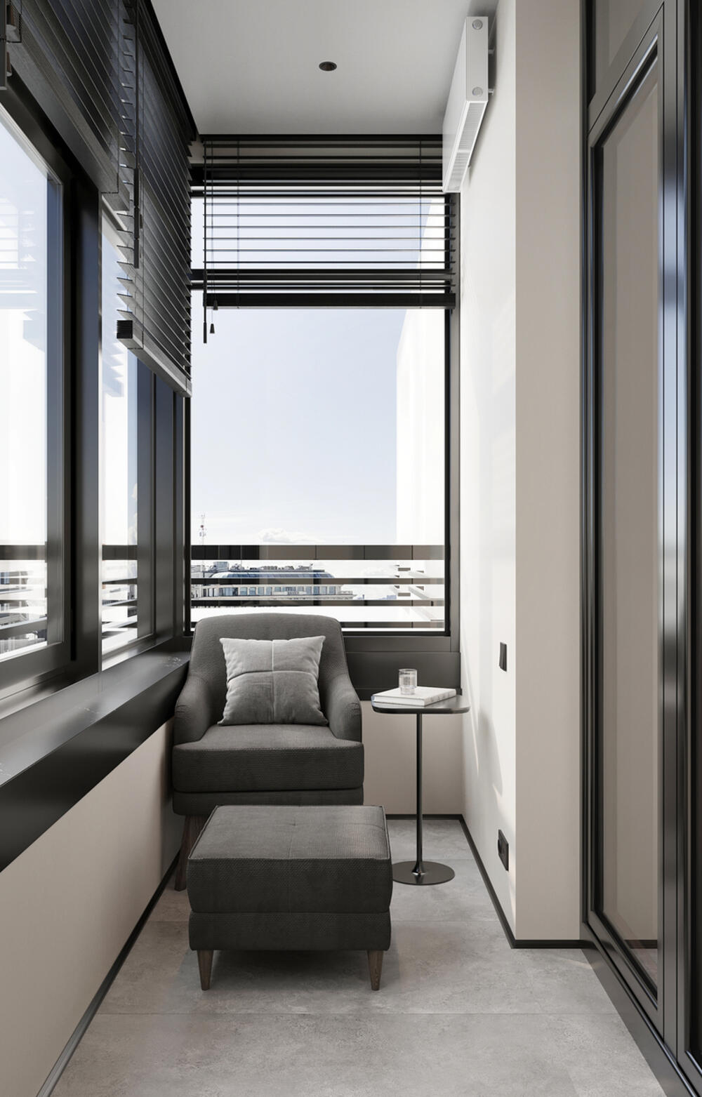 Здесь разместили кресло с пуфом и компактный столик — удобное место для чтения, работы с ноутбуком или утреннего кофе. Отделка выполнена в спокойных, нейтральных оттенках, а жалюзи позволяют управлять светом и настроением пространства в течение дня.