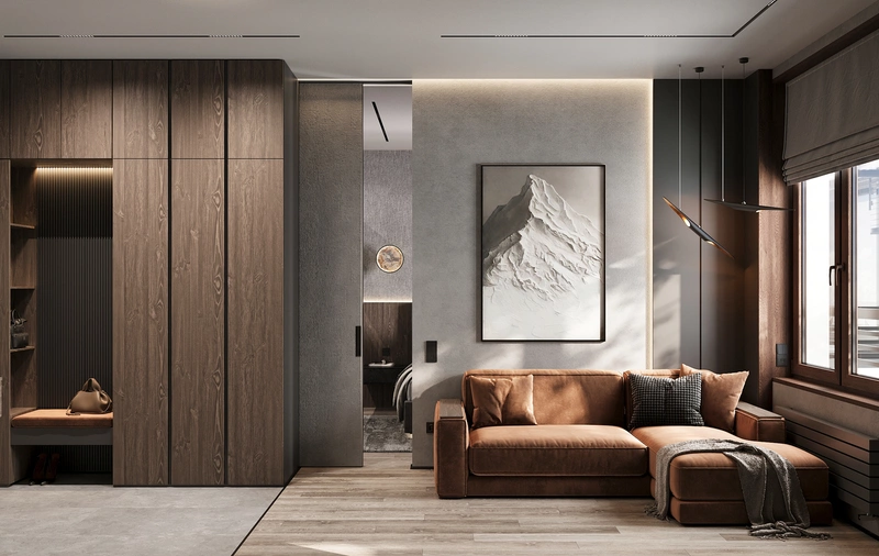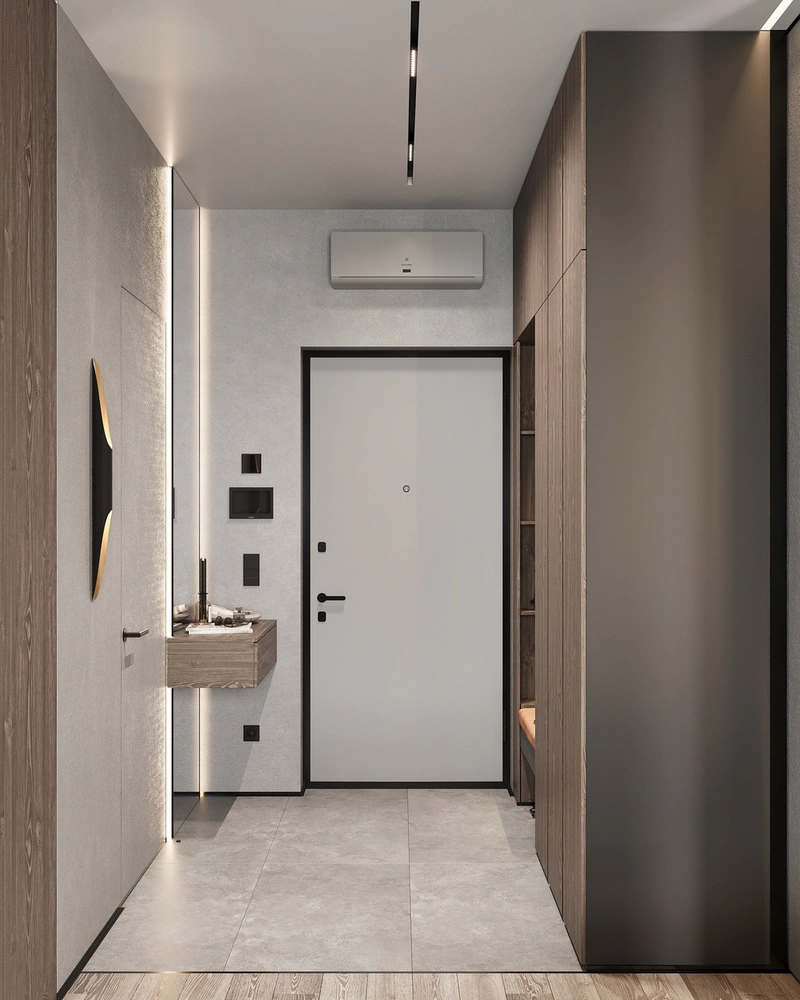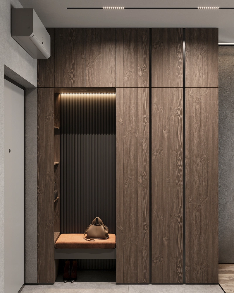 Шкафы с фасадами под тёмное дерево вытягивают вертикаль и поддерживают общую стилистику квартиры. В центральной части предусмотрена ниша с подсветкой и мягкой банкеткой — здесь удобно переобуваться, оставить сумку или верхнюю одежду на короткое время. Подсветка добавляет глубины и делает прихожую более выразительной в вечернее время.