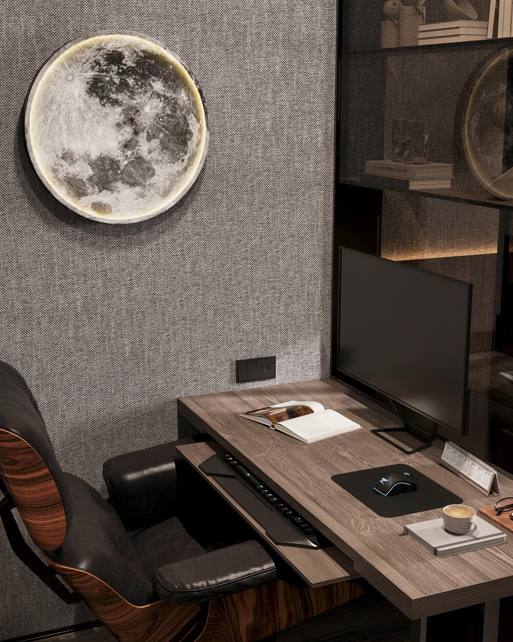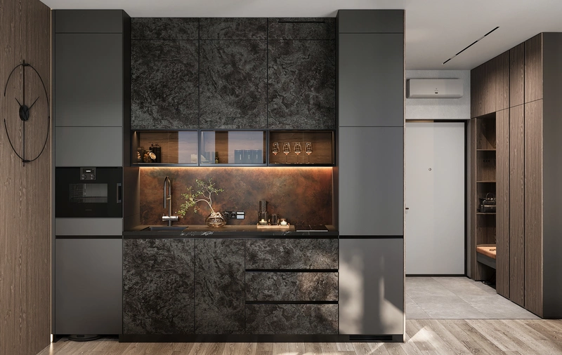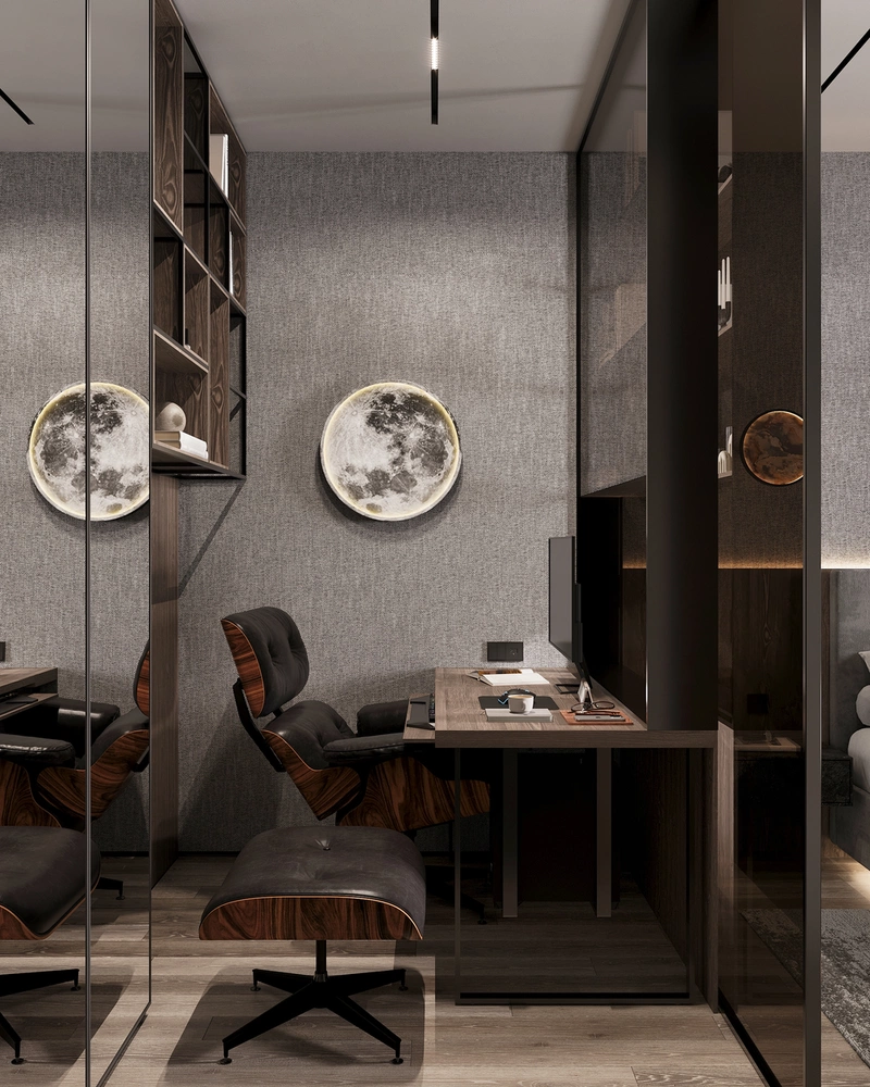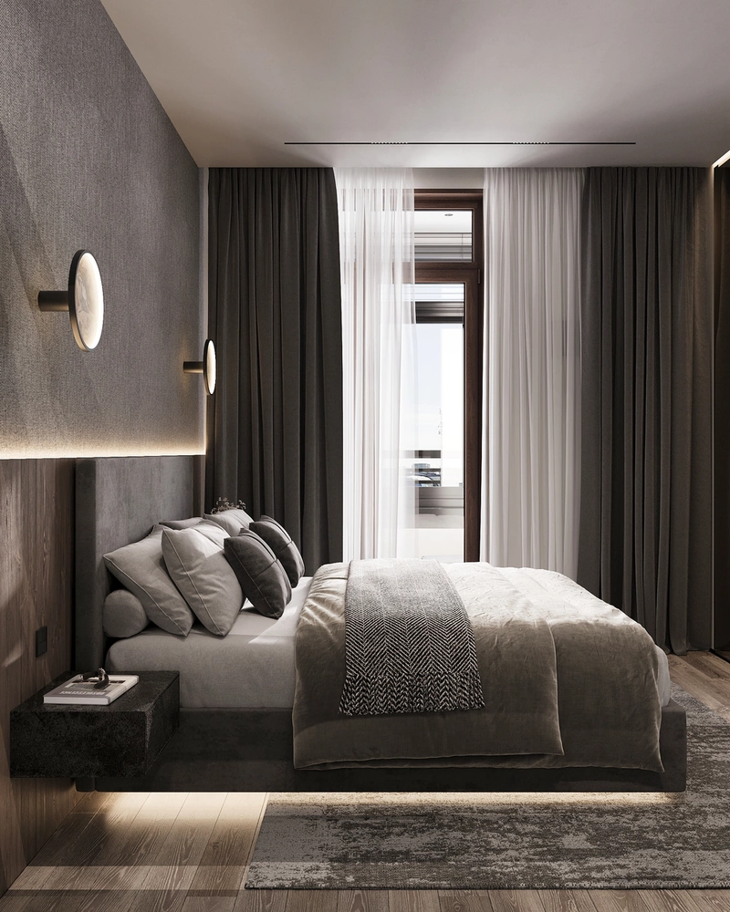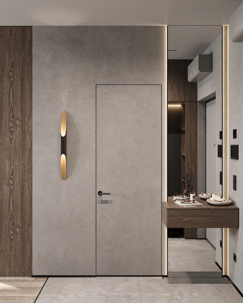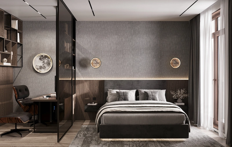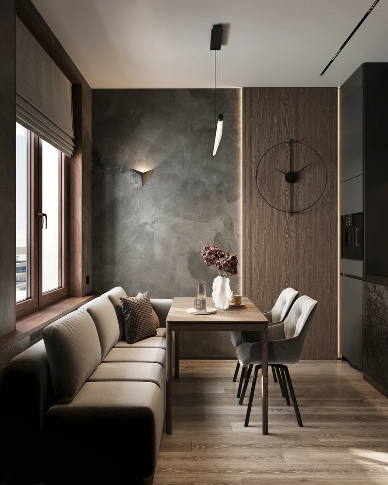 Проект выполнен в стилистике современного минимализма с лофт-элементами: простые формы, архитектурные линии, выразительные фактуры. Палитра построена на тёмных оттенках серого и бежевого, с акцентами тёплого дерева и чёрной графики в деталях.