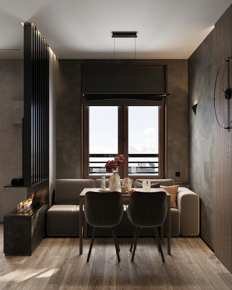 Ключевым элементом стала перегородка со встроенным паровым камином. Она мягко отделяет гостиную от кухни и работает как композиционный центр: со стороны дивана камин становится точкой притяжения, создавая атмосферу вечернего отдыха и неспешного общения. Низкая тумба под ТВ поддерживает эту линию — она не утяжеляет пространство и визуально удерживает горизонталь.