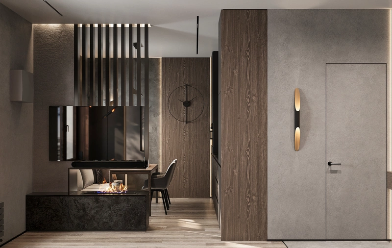 Изначально квартира от застройщика была единым открытым пространством без перегородок, поэтому ключевая задача — не «нарезать» метры, а собрать понятную логику: где встречаем гостей, где отдыхаем, а где можно спокойно работать. Мы не делали перепланировку, но выполнили грамотное зонирование: возвели перегородку, которая разделила квартиру на общественную часть (прихожая + кухня-гостиная) и приватную (спальня). В спальне добавили раздвижную стеклянную перегородку, чтобы выделить кабинет без потери света и ощущения объёма. А в кухне-гостиной появилась перегородка-тумба с паровым камином — она работает и как акцент, и как функциональный разделитель пространства.