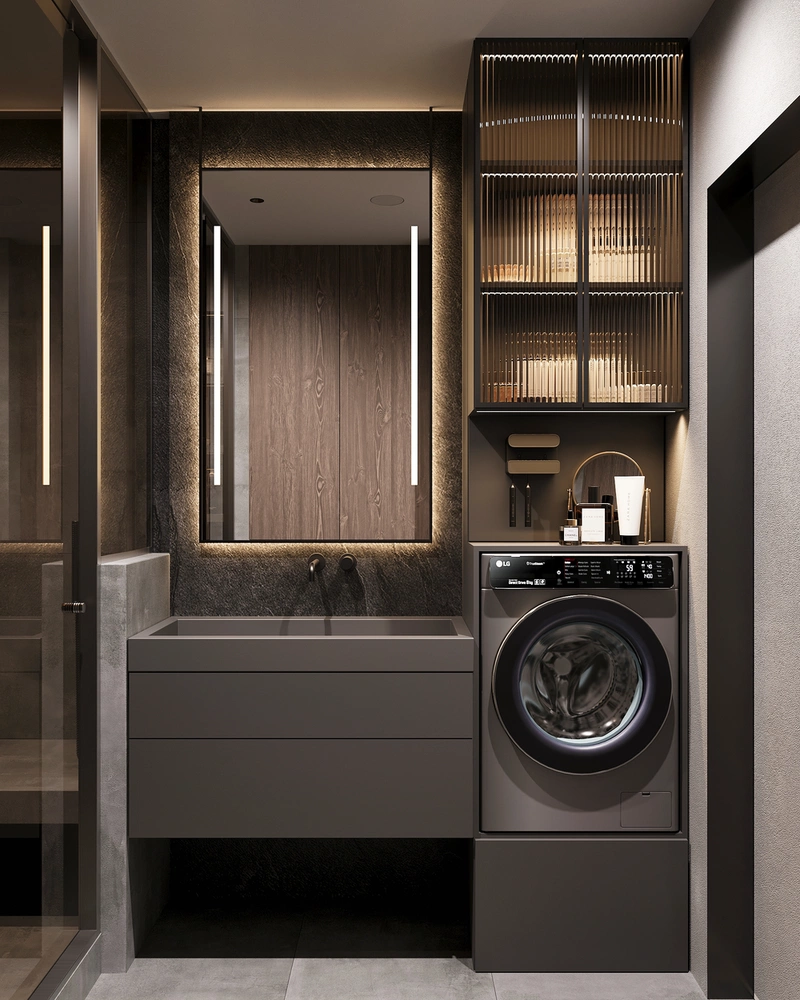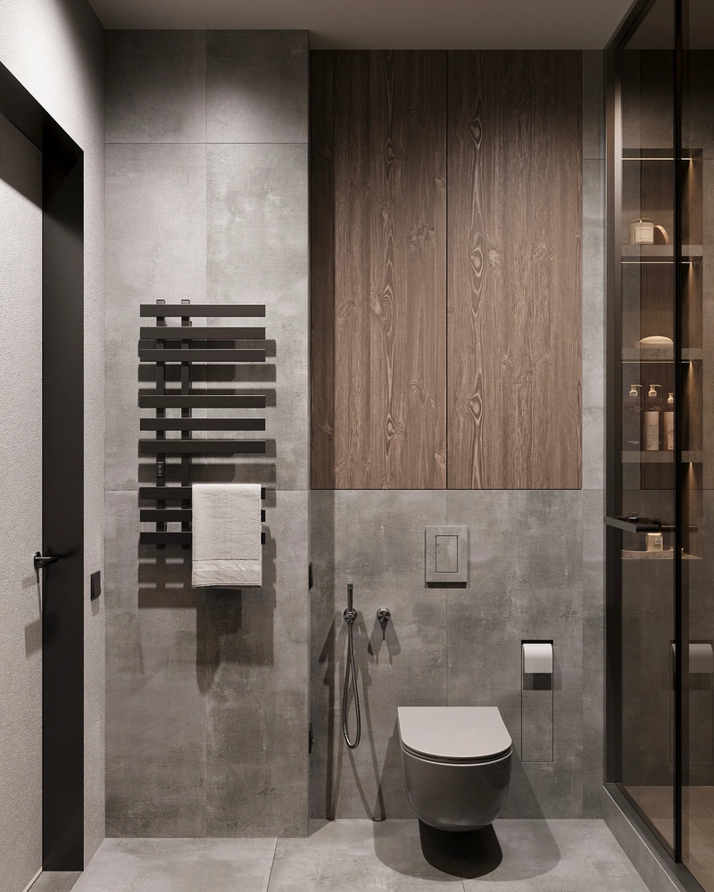 Основу отделки составляет керамогранит под бетон — он задаёт спокойный, нейтральный фон и поддерживает общую стилистику проекта. Тёплое дерево в мебели смягчает графику и делает пространство визуально более сбалансированным. Над инсталляцией предусмотрели закрытые шкафы во всю ширину стены, чтобы все бытовые принадлежности были скрыты и не нарушали целостность интерьера.
