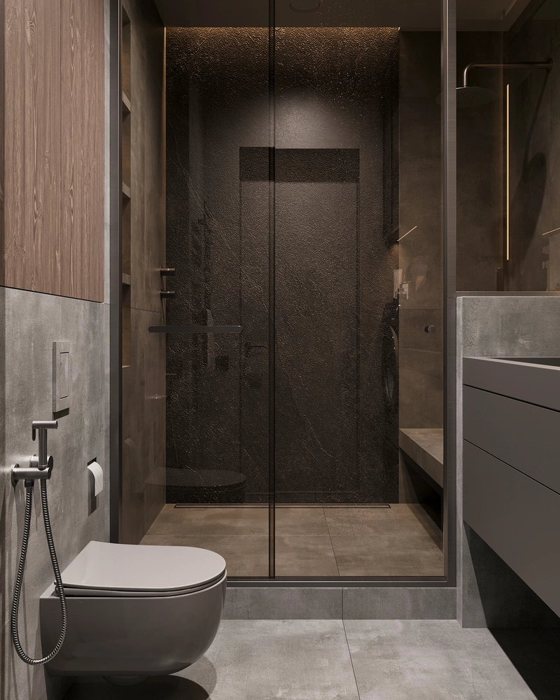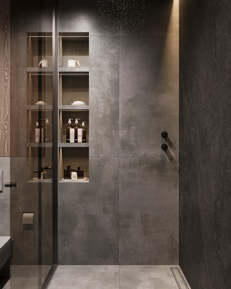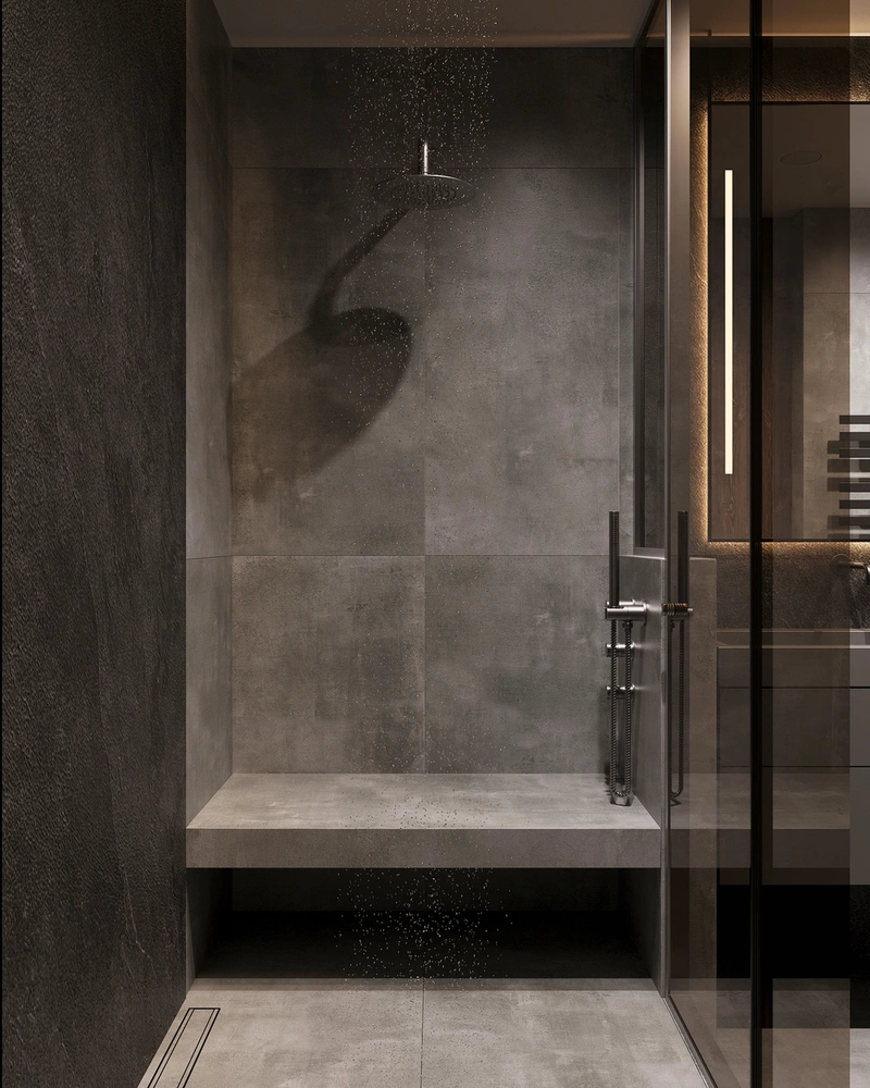 Зону душа оформили стеклянной перегородкой: она не дробит пространство и подчёркивает чистые линии. Вертикальная ниша с подсветкой добавляет глубины и работает как аккуратный акцент, а продуманное расположение сантехники делает использование санузла удобным в повседневной жизни.