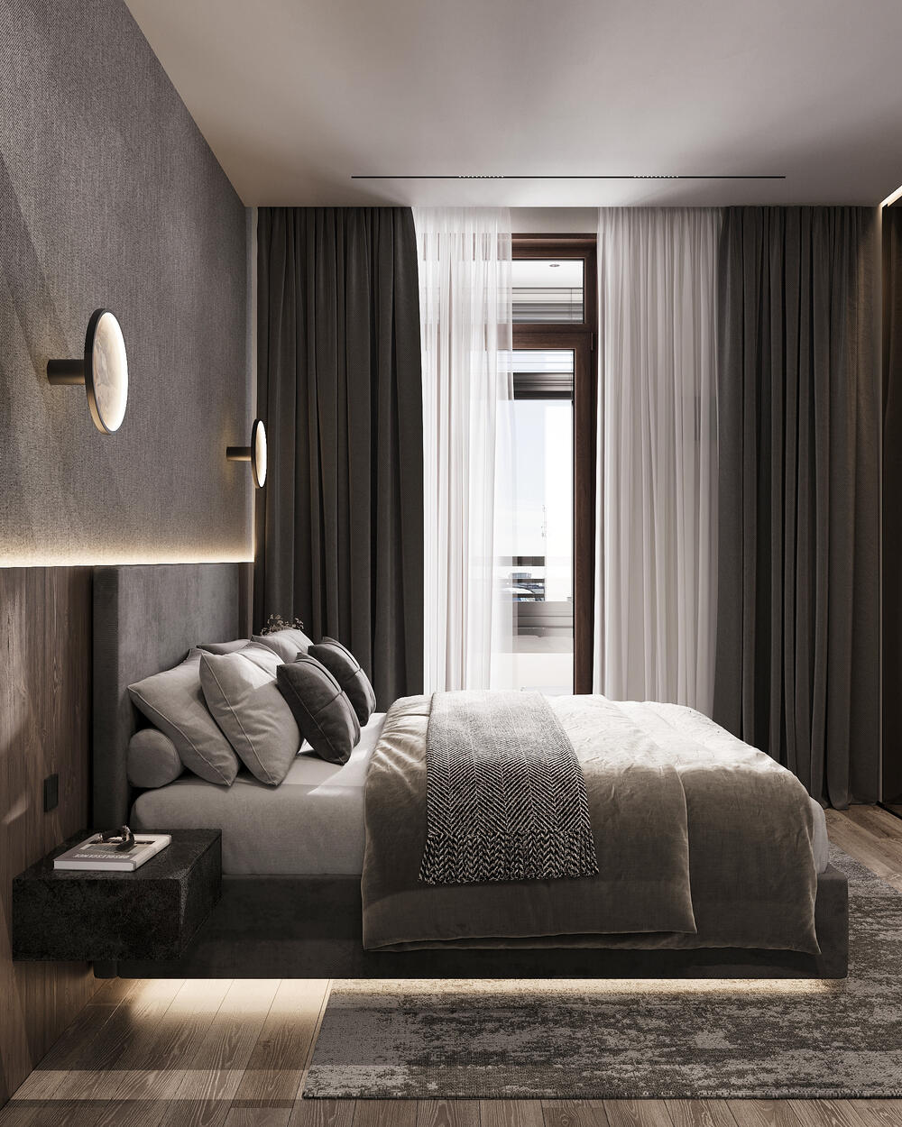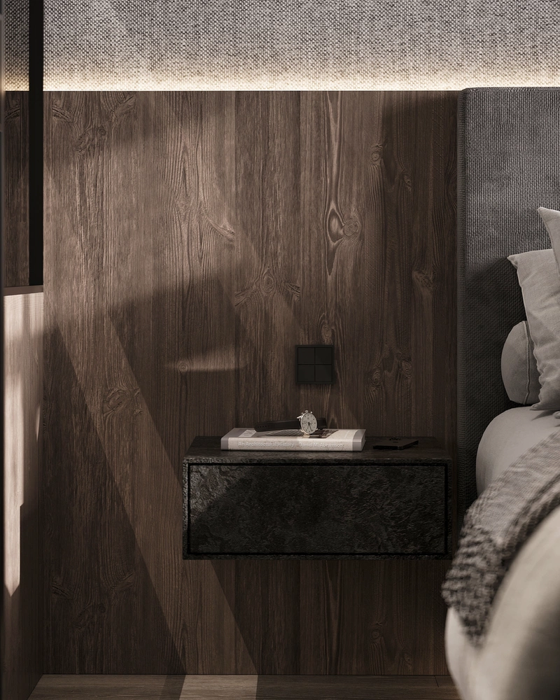 Спальное место расположили по центральной оси комнаты, акцентировали изголовье фактурной стеной с мягкой подсветкой. Тёплое дерево в отделке сочетается с приглушёнными серо-бежевыми оттенками. Прикроватные тумбы и встроенные элементы выполнены лаконично — всё под рукой, без лишних деталей.