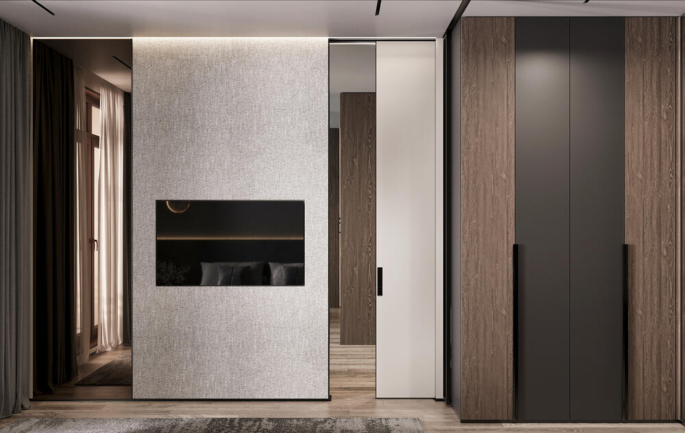 3D-панели — применены в зоне гостиной и спальни в качестве акцентной отделки. Они добавляют глубину и архитектурность, работая как выразительный, но ненавязчивый декоративный элемент.