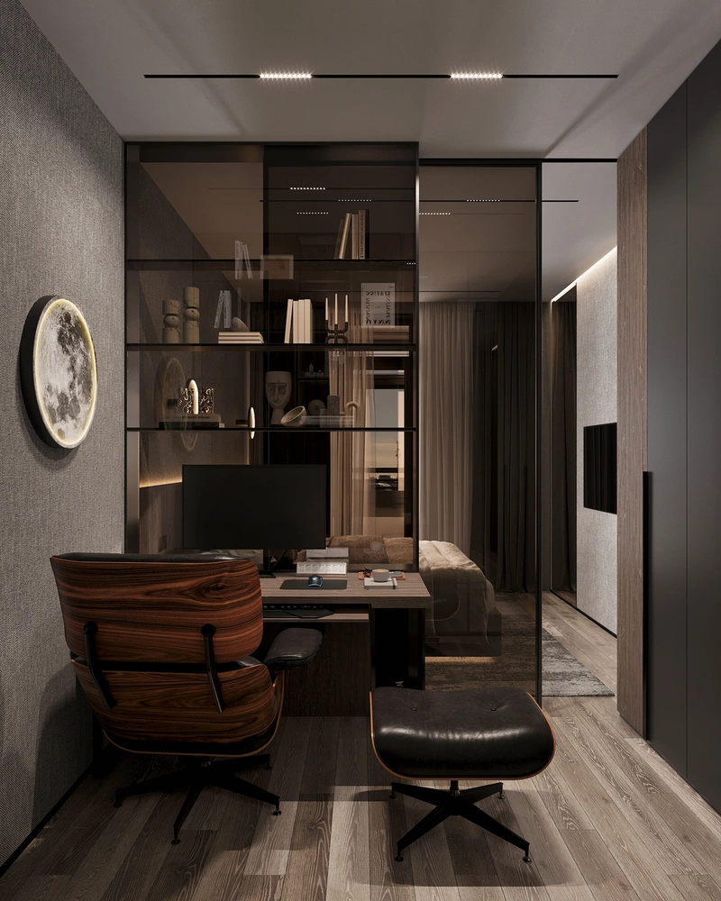 Рабочую зону мы отделили раздвижной стеклянной перегородкой. Такое решение позволяет изолировать кабинет при необходимости, но сохраняет свет и ощущение объёма в спальне. Рабочий стол встроен в систему хранения, поэтому зона выглядит аккуратно и не спорит с общим настроением комнаты.
