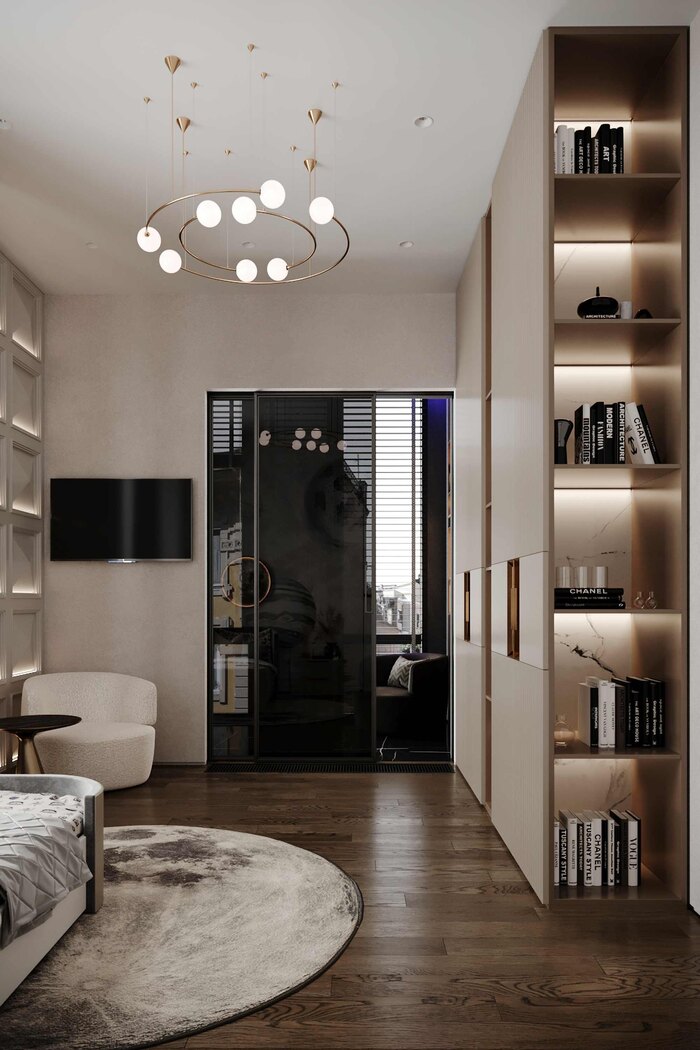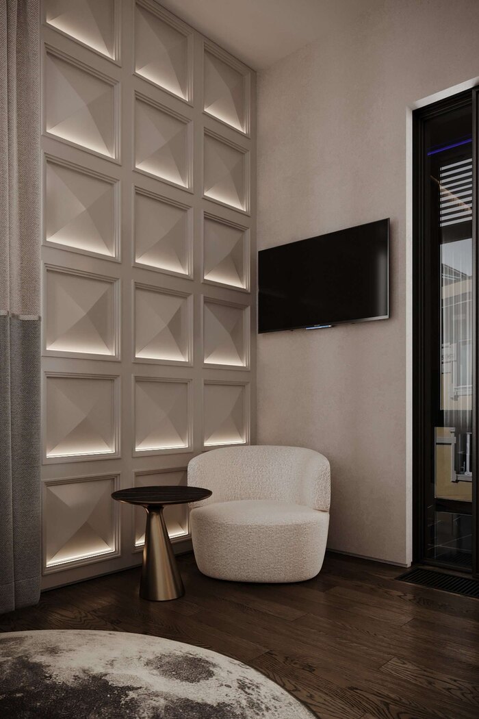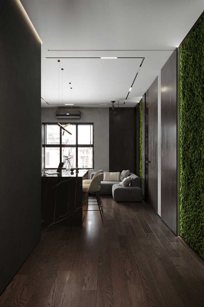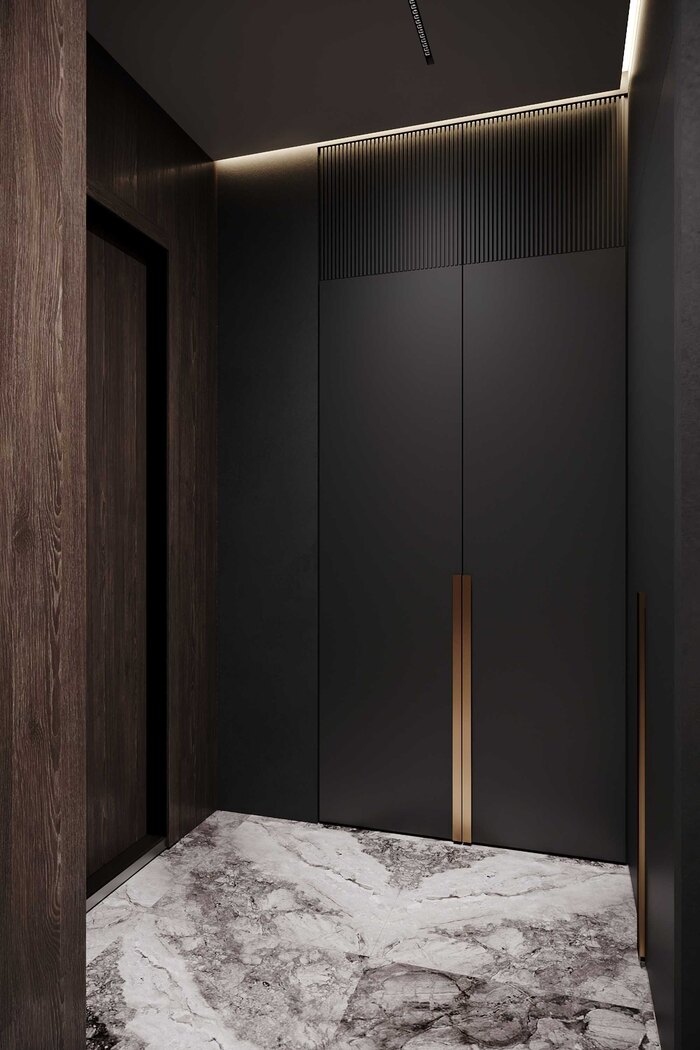 Интерьер квартиры выполнен в современном стиле с элементами премиального дизайна. Пространство сочетает функциональность, выразительные материалы и глубокие оттенки, создавая атмосферу сдержанной роскоши.
