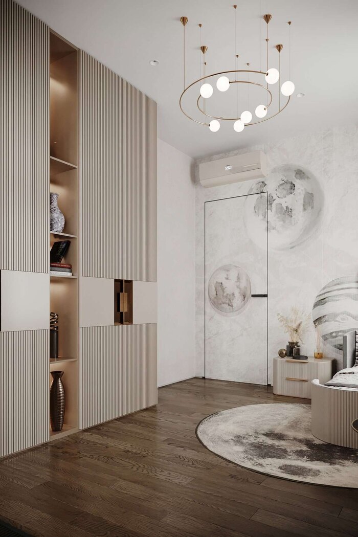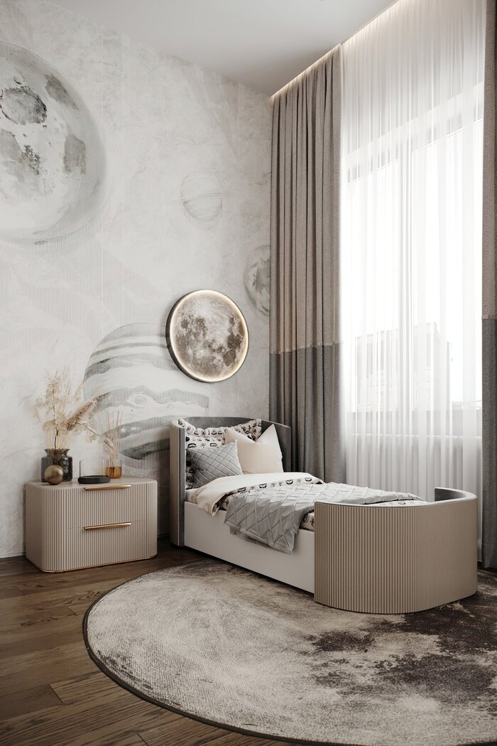 Интерьер вдохновлен космическими мотивами, но выполнен без излишней детскости. На стенах — крупные графические изображения луны и планет, создающие эффект глубины. Это решение добавляет комнате оригинальности, но при этом остается нейтральным и стильным.
