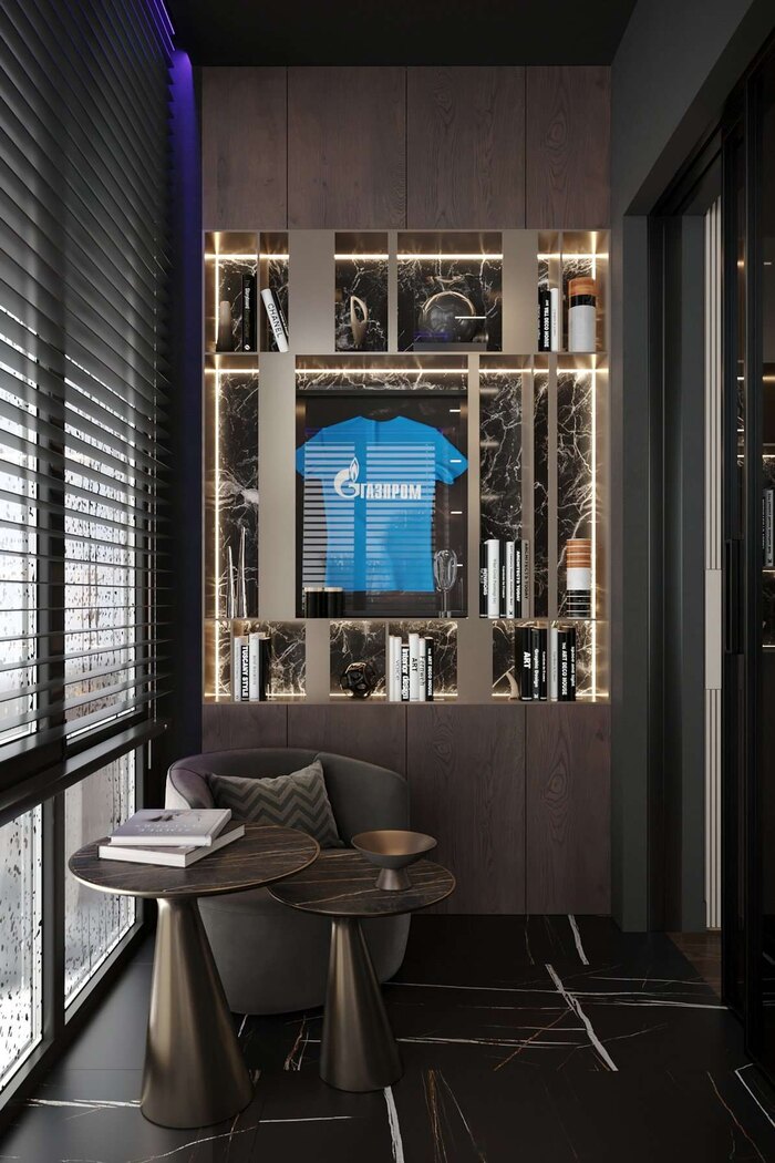 Лоджия была утеплена, что позволило организовать здесь комфортное рабочее место. Компактный, но функциональный письменный стол встроен в нишу и оборудован двумя мониторами для удобной работы. Дополняют зону удобное кресло и стеллажи с подсветкой, где хранятся книги и элементы декора.
