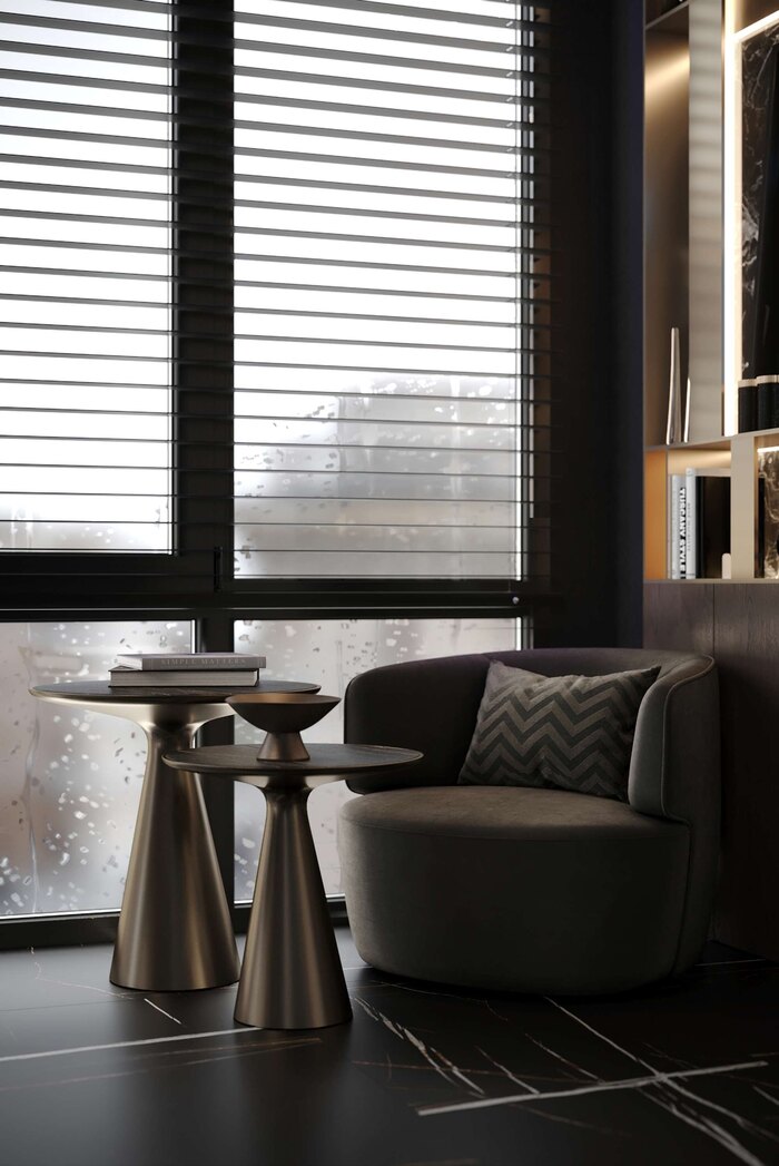 - Бежевые и молочные акценты в мягкой мебели – создают легкий контраст с темной палитрой.
