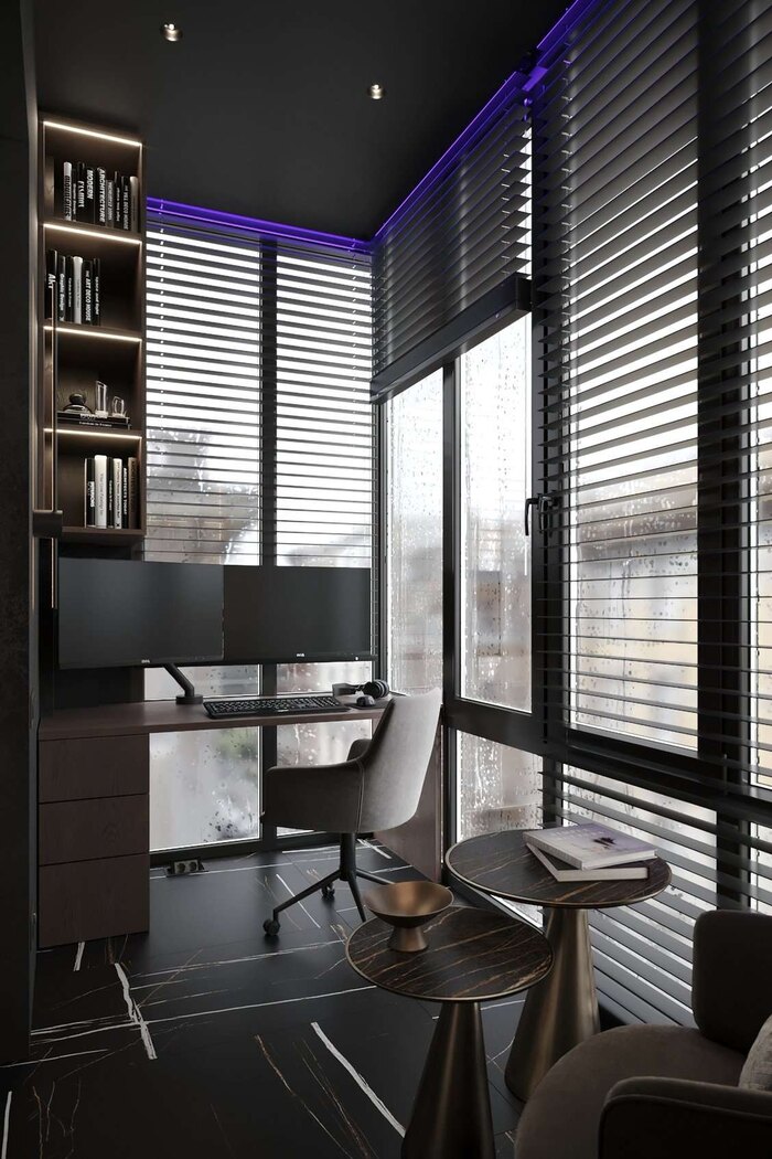 - Утеплить балкон и сделать максимально панорамное остекление черного цвета. На нем организовать кабинет мужа