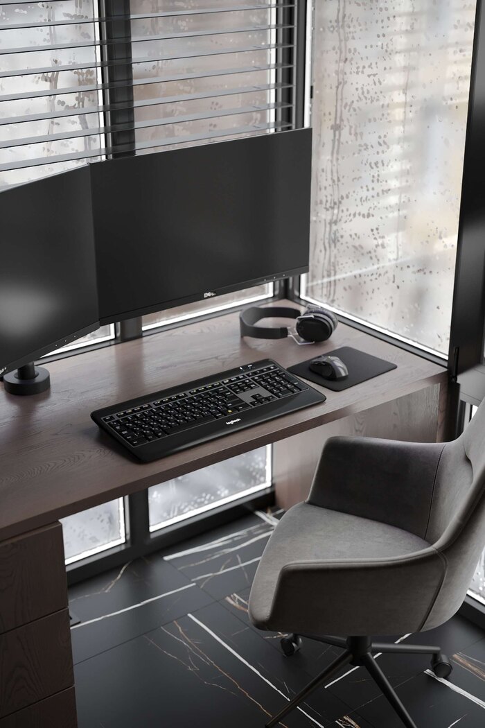Черные рамы панорамных окон придают пространству стильный, индустриальный вид и обеспечивают максимальное проникновение естественного света. Жалюзи помогают регулировать уровень освещения, создавая комфортные условия для работы в любое время суток.