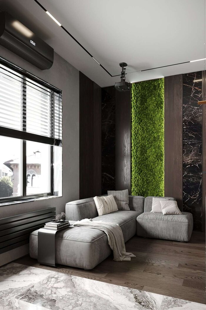 - Стабилизированный мох и живые растения - зеленые акценты в интерьере создают баланс между природными и индустриальными материалами. Стена с мхом в ванной комнате делает пространство динамичным и добавляет свежести.