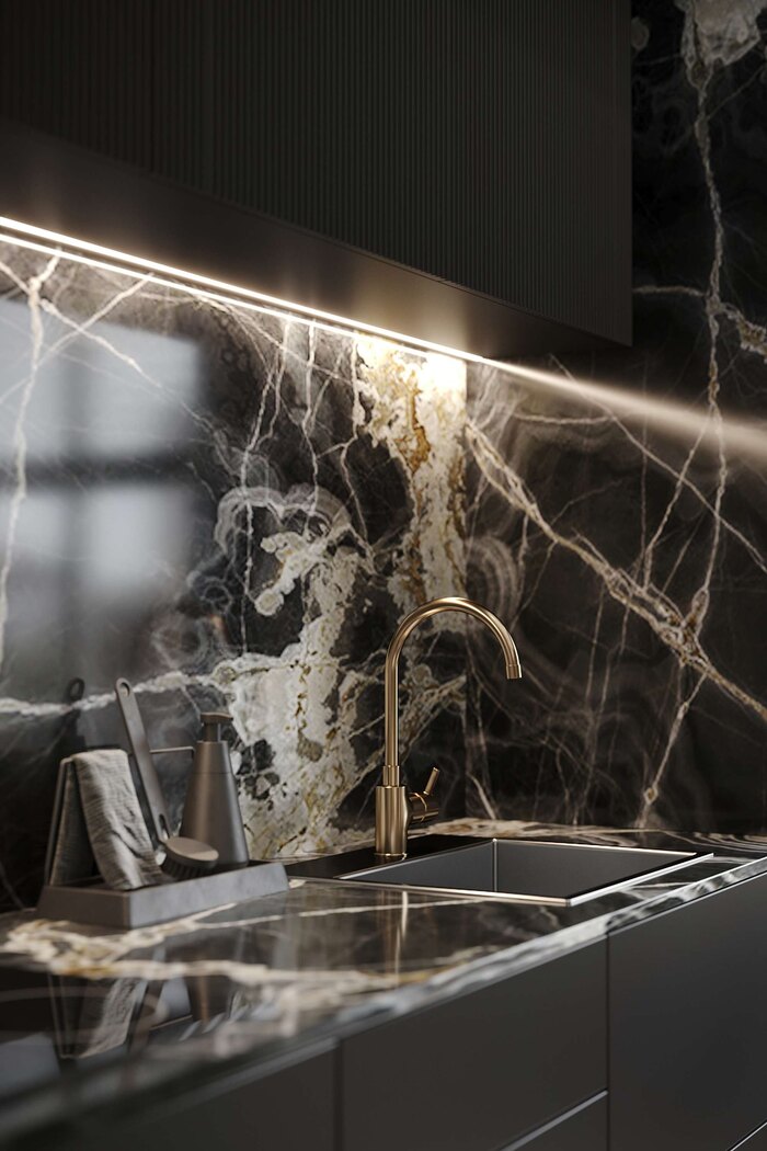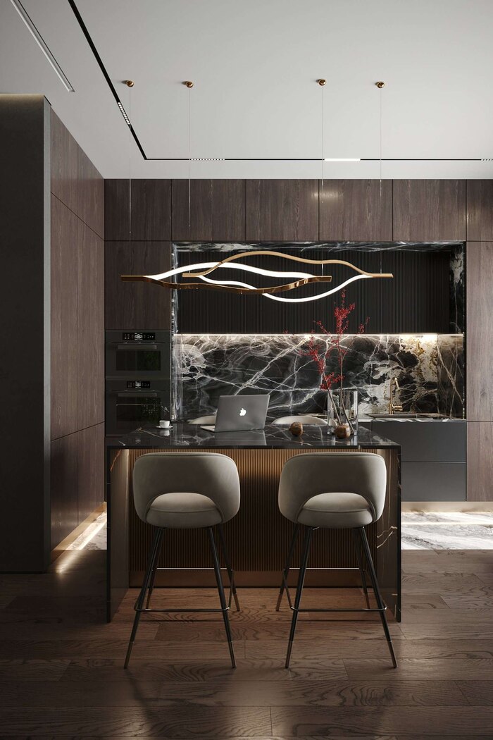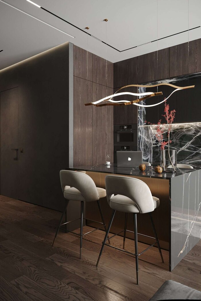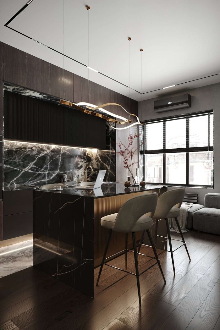 В кухонной зоне преобладают темные оттенки с теплыми акцентами: графитовые фасады мебели, текстурированные панели под дерево и латунные детали. Столешница выполнена из натурального камня с выразительным рисунком, что подчеркивает премиальность пространства.