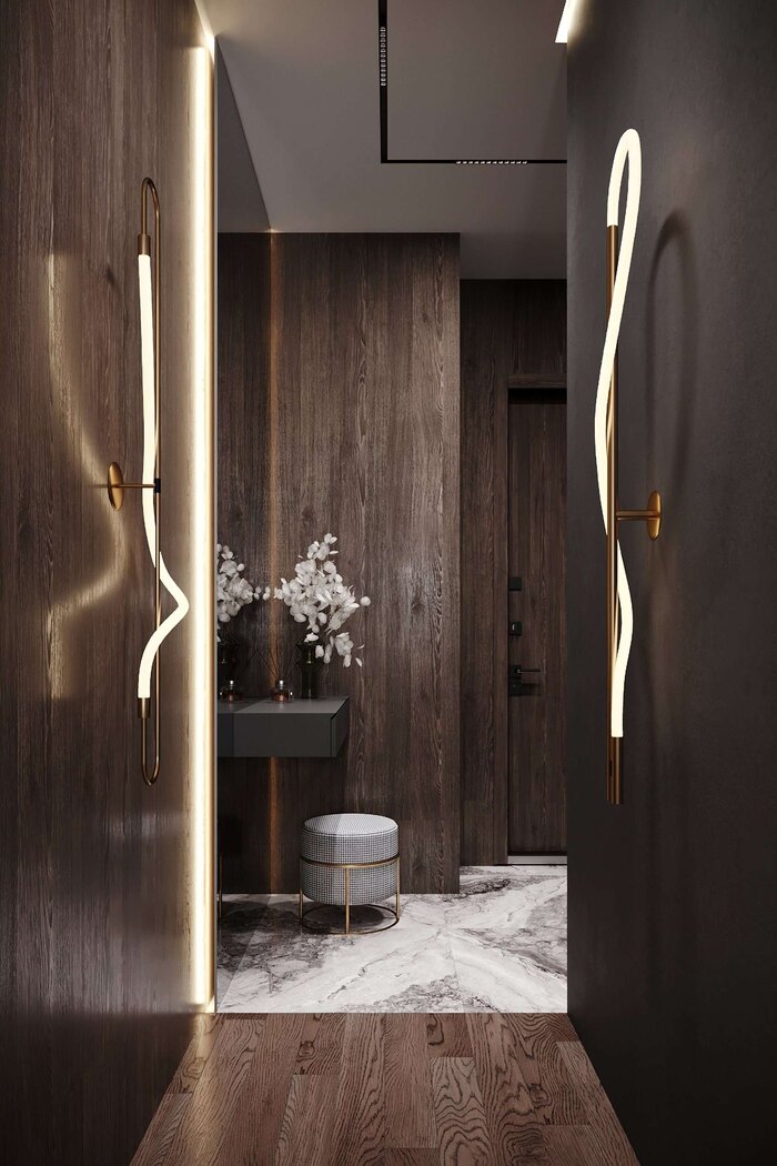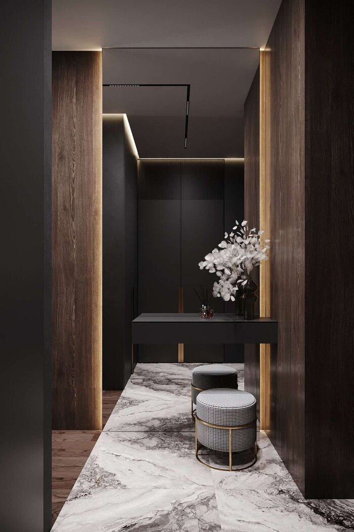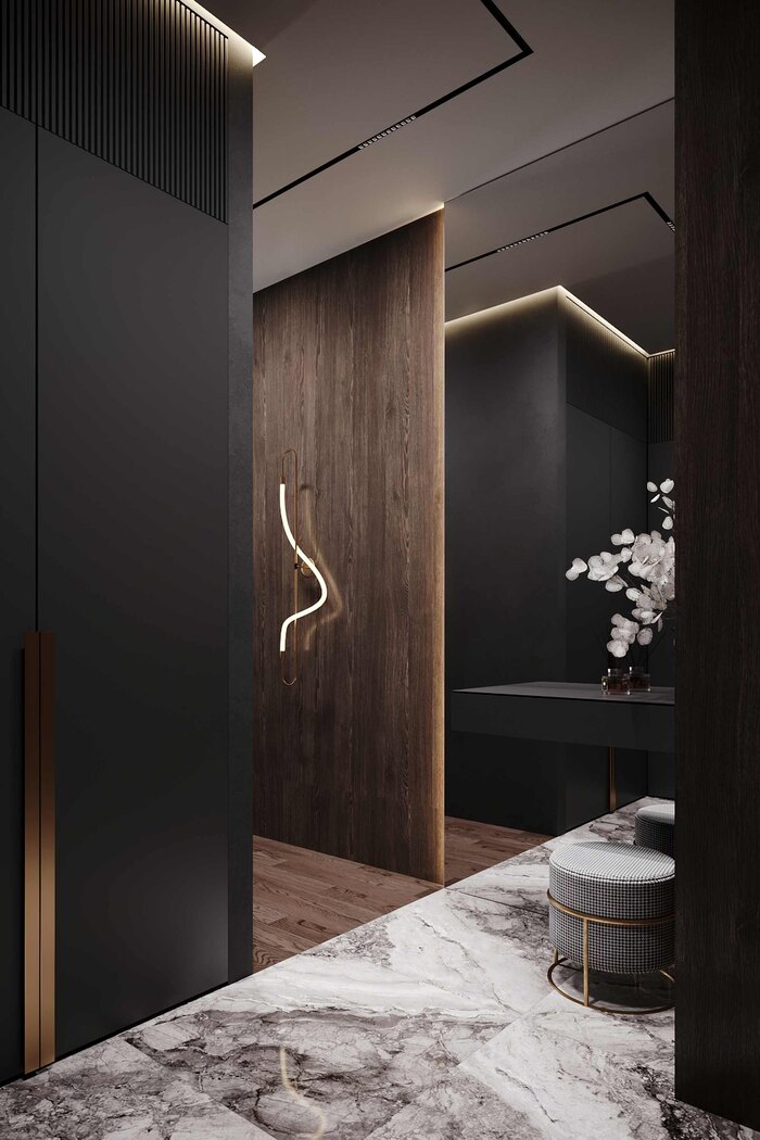 Использование натурального дерева, керамогранита с выразительным рисунком и латуни придало интерьеру статусность и глубину, а игра с подсветкой и фактурными материалами сделала пространство объемным и динамичным.