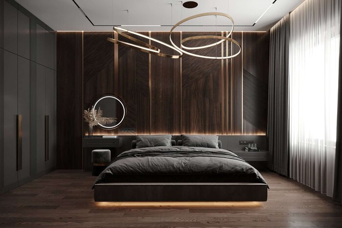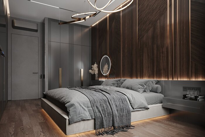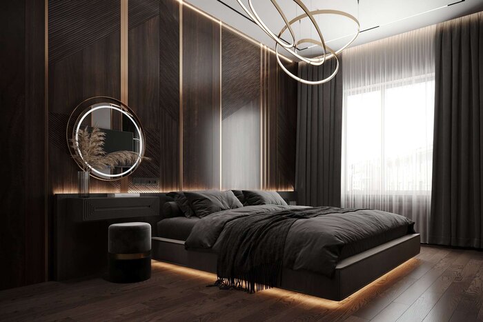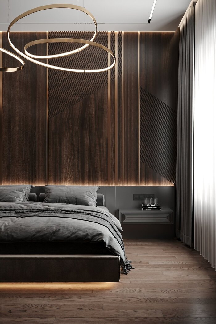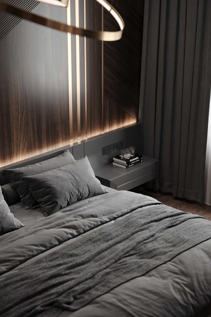 Зона изголовья оформлена темными панелями с вертикальным рельефом, которые добавляют глубину пространству. Фоновая подсветка подчеркивает текстуру дерева и создает мягкую, расслабляющую атмосферу.