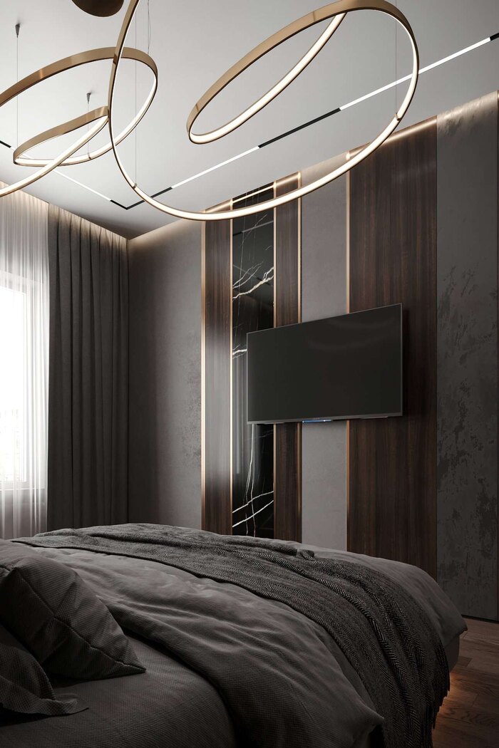 Спальня с парящей кроватью и теплой подсветкой стала местом расслабления и уединения.