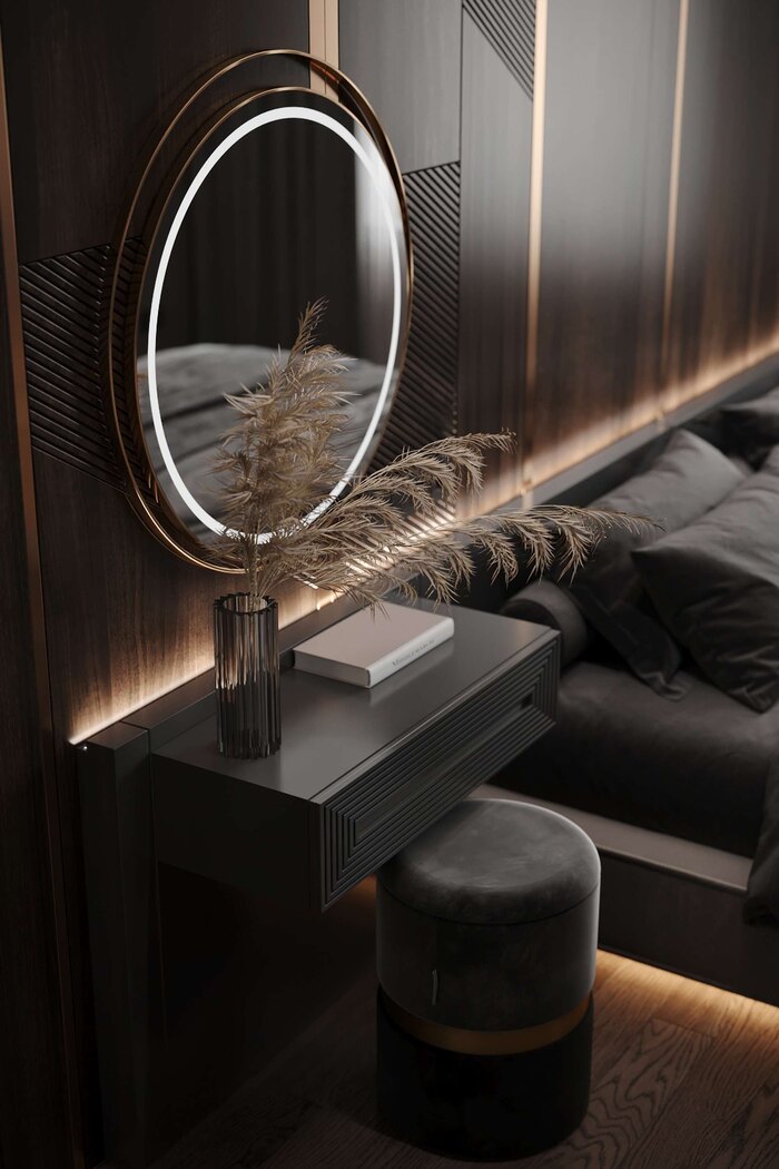 Главный акцент в спальне — кровать, создающая эффект невесомости за счет скрытых опор и мягкой подсветки по периметру основания. Этот дизайнерский прием не только добавляет комнате визуальной легкости, но и подчеркивает футуристичность интерьера. Кровать оснащена подъемным механизмом, что делает ее не только эстетичной, но и максимально функциональной.
