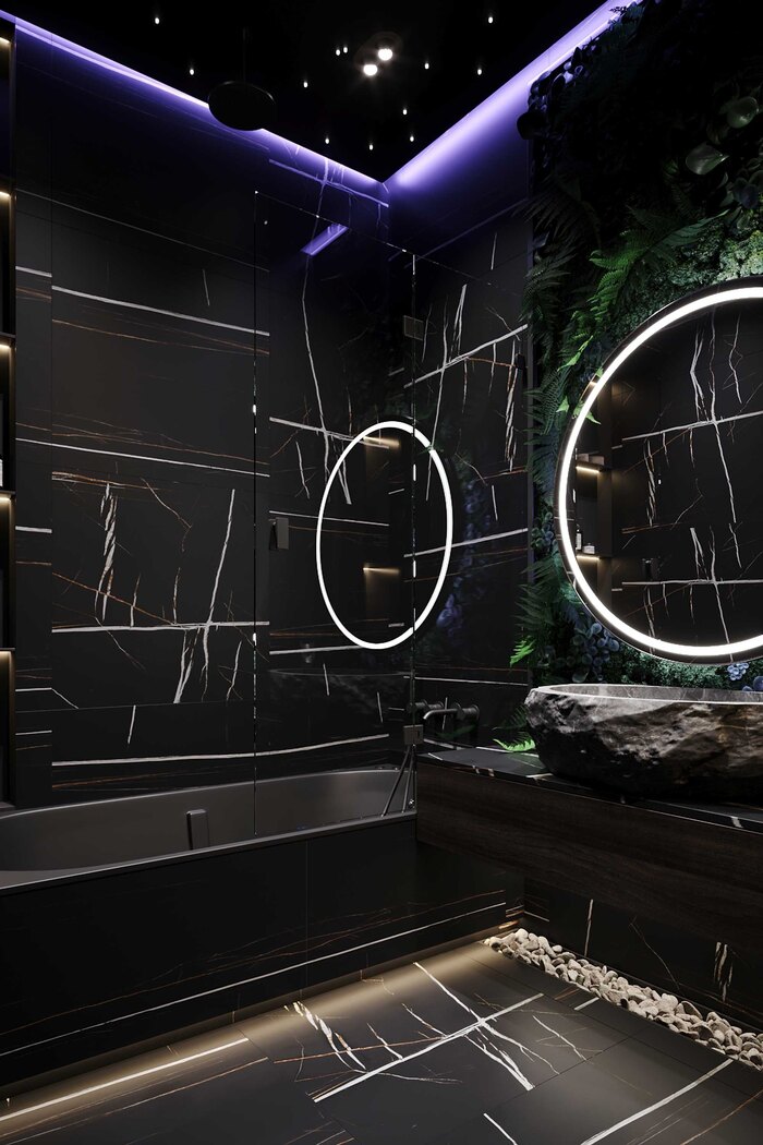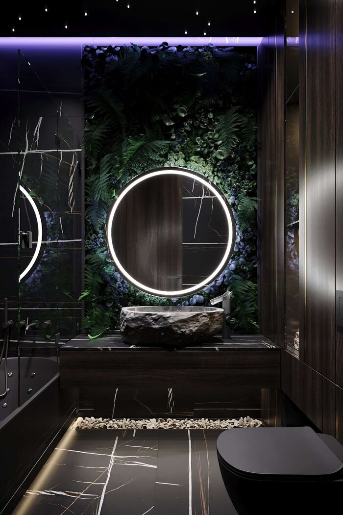 Редкое и смелое решение, которое делает ванную комнату похожей на спа-зону. Контраст между черной поверхностью, зеленым мхом и подсветкой усиливает эффект глубины пространства.