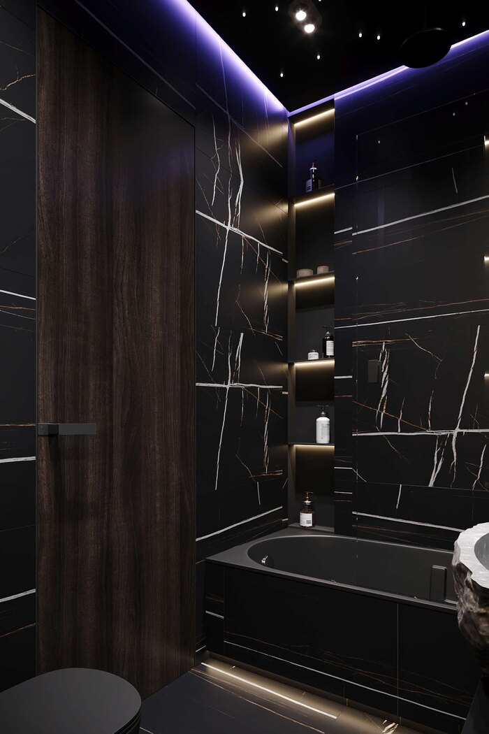 Ванная — настоящая зона SPA с черной гидромассажной ванной, стабилизированным мхом и потолком "звездное небо".