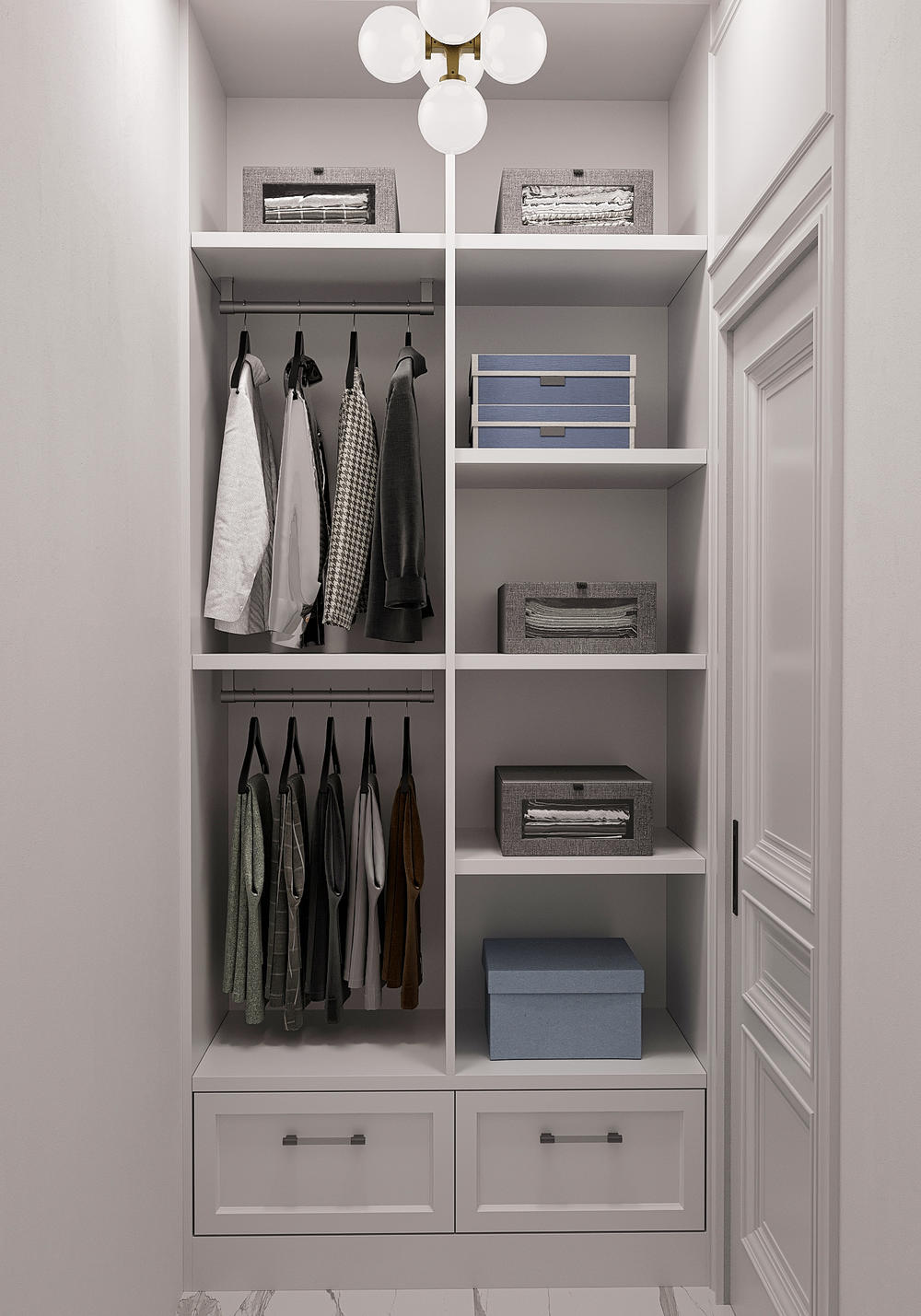 Внутри — открытые секции с двумя уровнями штанг, полки для коробок и выдвижные ящики. Всё удобно организовано: легко достать нужное, быстро убрать лишнее.