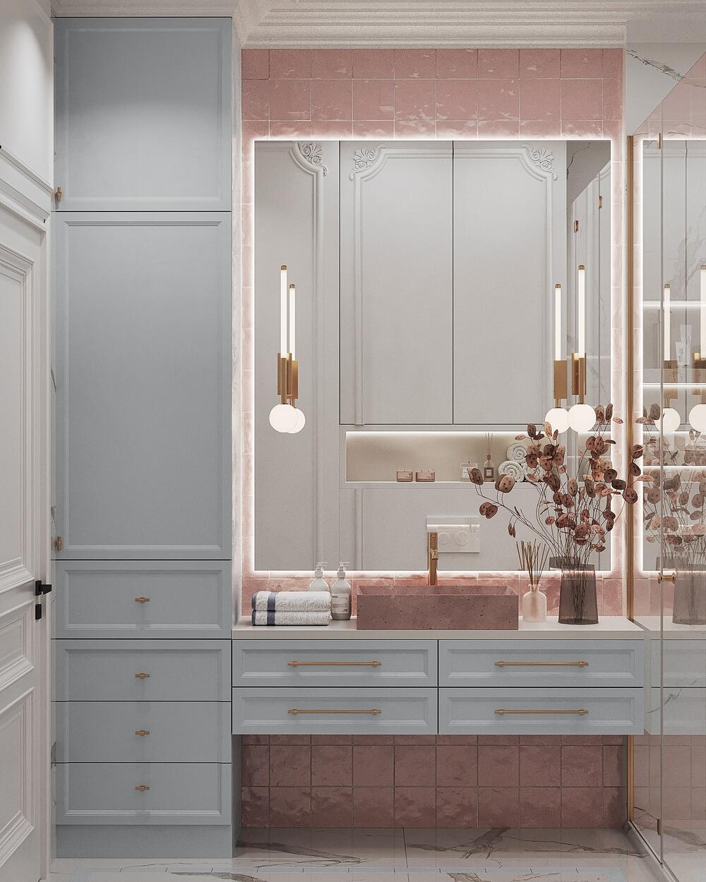 Палитра светлая, с пудровыми акцентами и темной графикой по контуру. Всё выглядит спокойно и собранно. Вся система хранения встроена, ничего не мешает — и при этом всё под рукой.