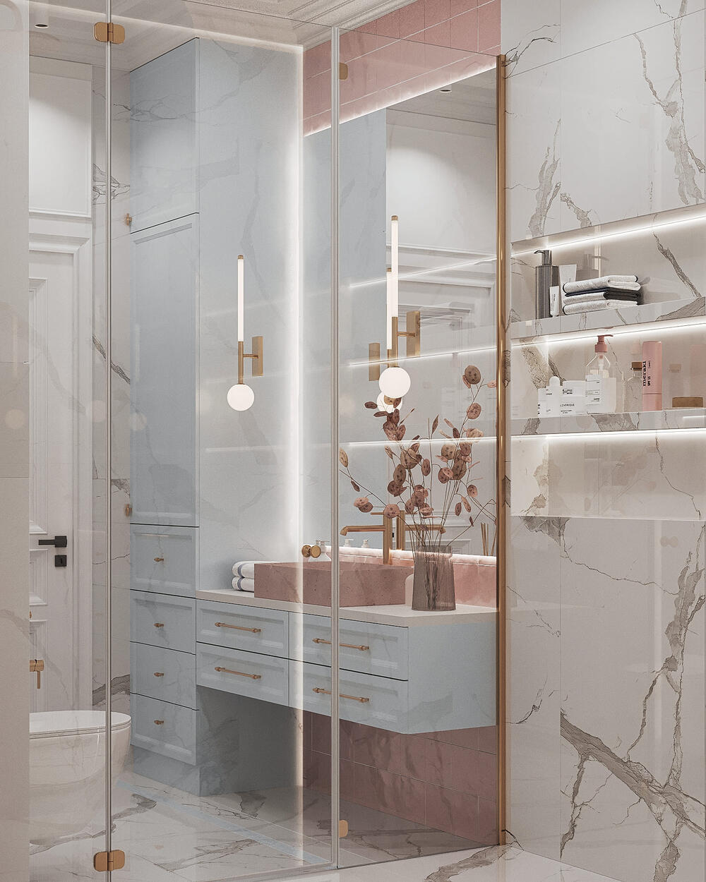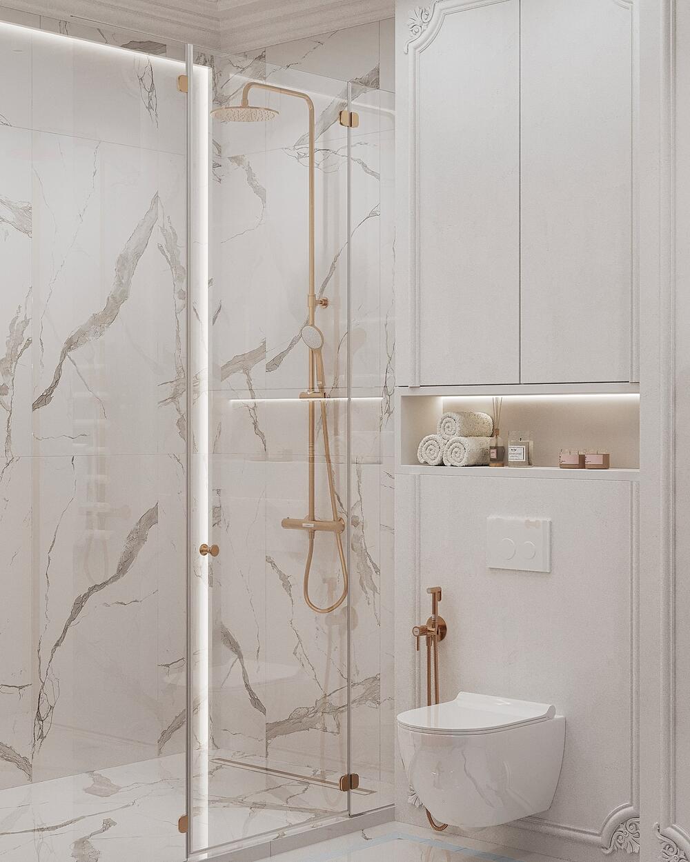 Основная ванная оформлена в светлой гамме с мраморной плиткой и латунной фурнитурой — получилось элегантно и свежо. Вместо ванны — просторная душевая с прозрачной перегородкой, тёплым освещением и верхним тропическим душем.